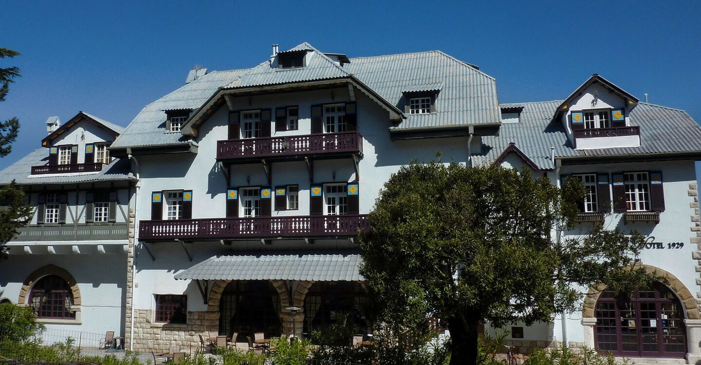 Wir beginnen unsere Wanderung am (01) Hotel Elafos (620 m). In luftiger Höhe, 619 m über dem Meeresspiegel, wurde es von den Italienern errichtet. Es beherbergt 24 liebevoll restaurierte Zimmer und ist im Stil der 30er Jahre eingerichtet. Die Anlage verfügt über den Komfort eines modernen 3-Sterne-Hotels. Blicken wir auf das Hotelgebäude, so gehen wir zunächst links, anschließend vorbei an einem zweiten verfallenen Hotelkomplex und dann auf der Schotterpiste leicht bergab in den schattenspendenden Zypressen- und Pinienwald hinein.