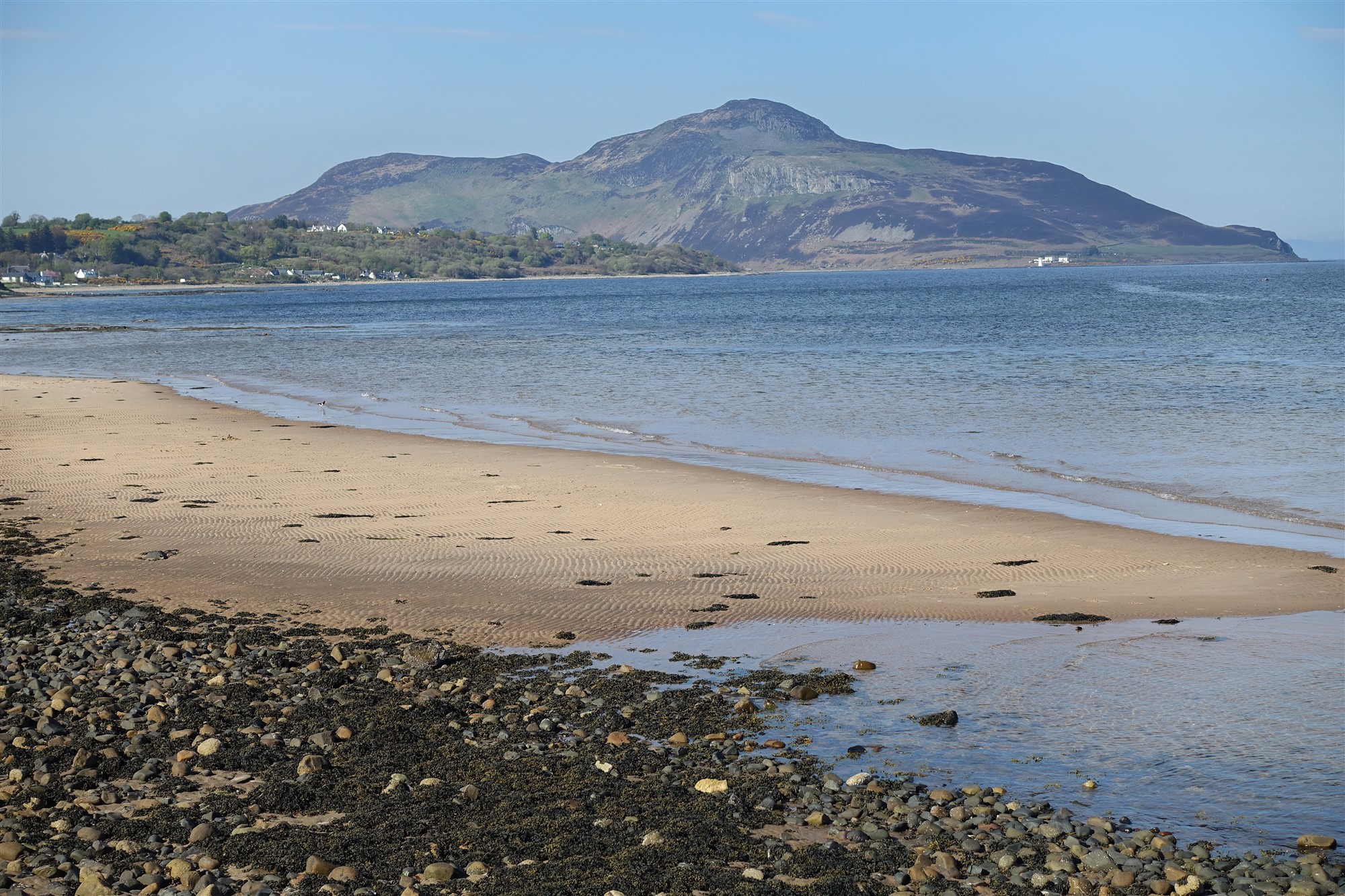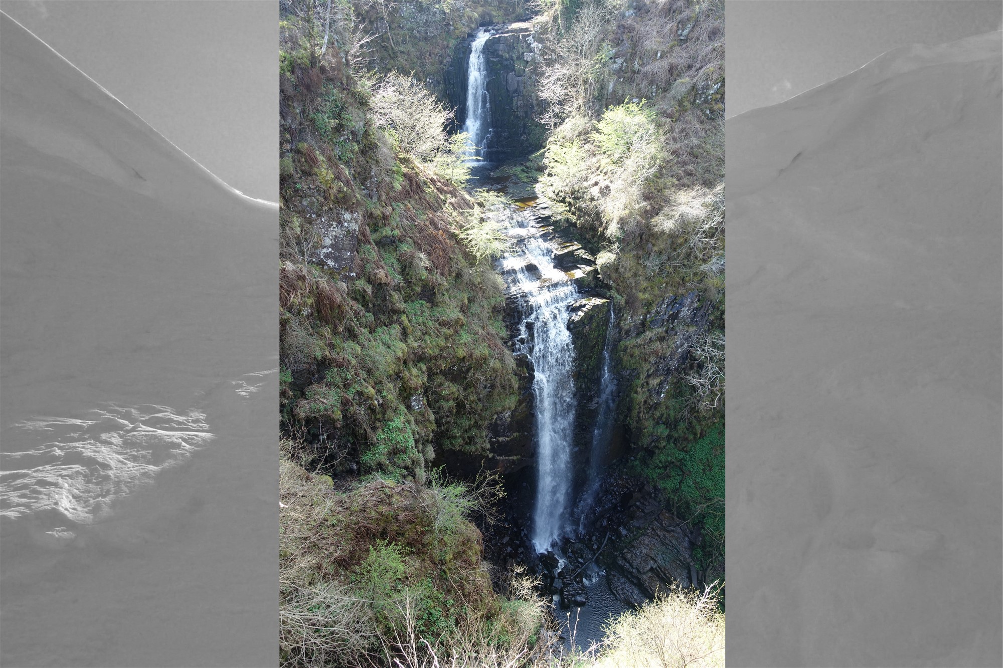 Nach weiteren 85 m endet der Pfad. Wir gehen auf der Piste rechts und bei der nächsten Weggabelung sofort wieder rechts. Nur kurz später ergibt sich ein wunderbarer Weitblick über die Whiting Bay mit der dahinter liegenden Insel Holy. Schon bald vernehmen wir deutlich das Rauschen des 03 Glenashdale Falls (45 m). Auf dem bergab führenden Pfad am Zaun entlang erreicht man den schönsten Aussichtspunkt. Wir steigen wieder auf und queren das Flussbett nach rechts, Picknickbänke am Flussufer laden zum Verweilen ein.