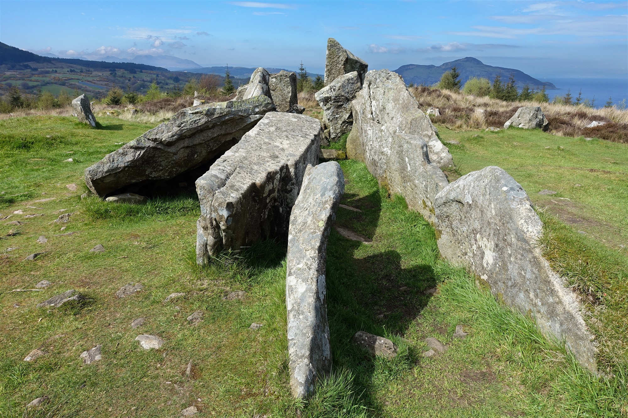 Nach 550 m, wir haben bereits die letzten Häuser hinter uns gelassen, gehen wir links in Serpentinen auf einem angelegten Weg bergauf, bis wir bei einer kleinen Lichtung auf die 02 Giants’ Graves (128 m) und Informationstafeln treffen. Im vorderen Bereich befindet sich eine Megalithanlage und kurz dahinter die Reste einer weiteren Kammer. Bei Ausgrabungen wurden in der hinteren Kammer Feuersteinmesser, zerscherbte Keramik, Pfeilspitzen und verbrannte Knochenreste gefunden.