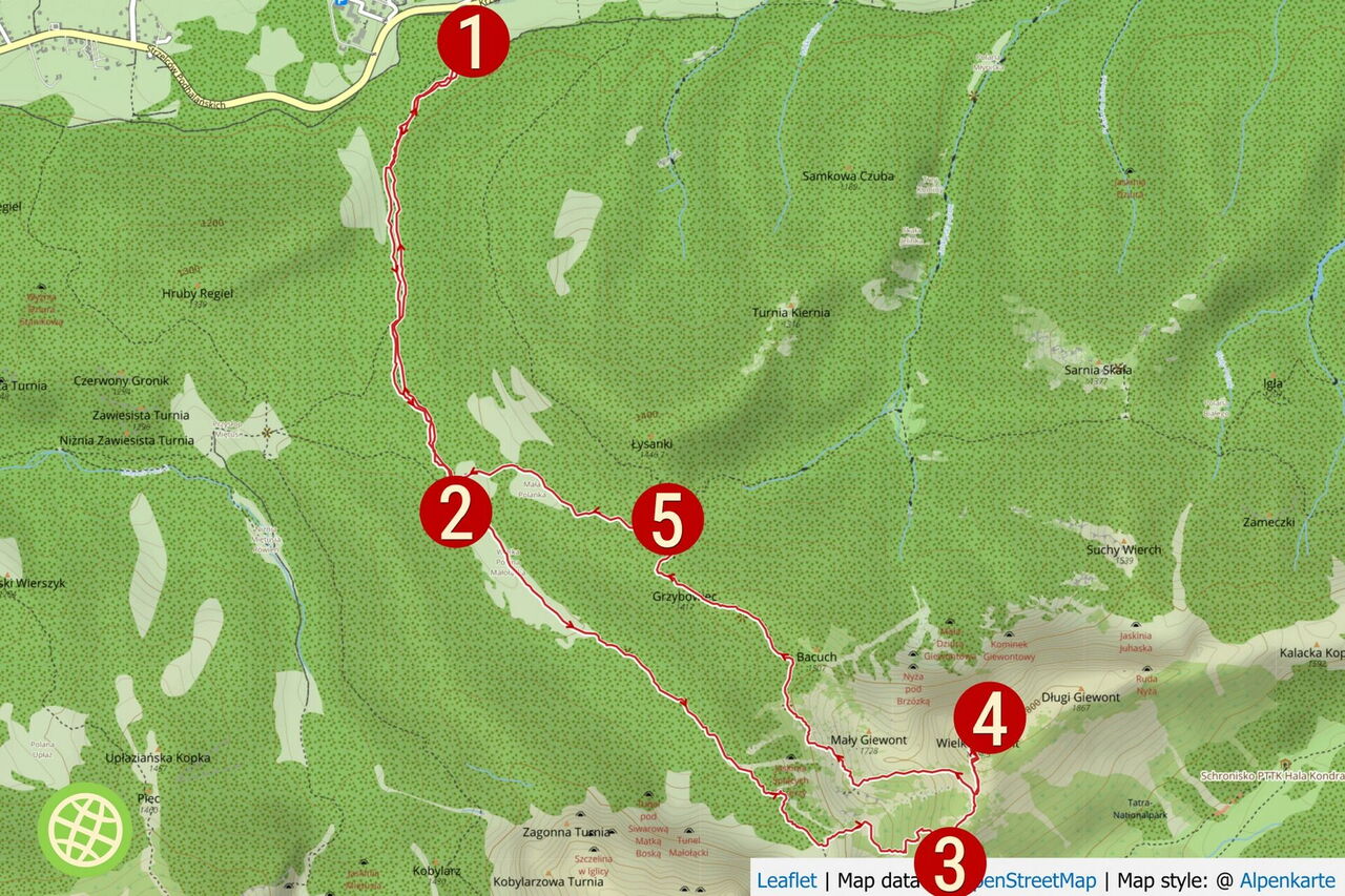Vom Parkplatz gehen wir in südliche Richtung und beginnen den Aufstieg durch die 01 Dolina Małej Łąki (940 m). Dieser Weg ist gelb und rot ausgeschildert. Nach ca. 1,4 km entlang des Bachlaufs gehen wir bei der ersten Weggabelung halb links und folgen dem gelb markierten Wanderweg.
