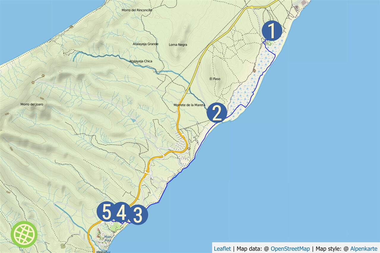 Bei Ebbe ein einfacher Strandspaziergang. Bei Flut müssen Felsen umlaufen werden und es gibt kleinere Kletterstellen. Art des Weges: 100 % Sandweg. Ausrüstung: Sonnenhut und Sonnencreme. Einkehr: Bars und am Ende der Wanderung ein Restaurant. Beste Wanderzeit: ganzjährig. Erlebnis: die Lagunenlandschaft am Playa Barca, die Dünenlandschaft bei Risco del Paso und die Atlashörnchen.