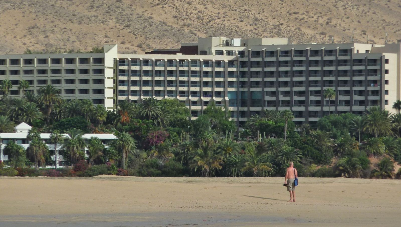Nach Erkundung zweier riesiger vom Wind geformter Dünen wird der folgende Strandabschnitt schmaler und bei Flut gibt es kleinere Kletterstellen über Kieselsteine. An der einsamen Strandbucht des Playa El Salmo wird die Mündung des Barranco los Canarios gequert. Im weiteren Verlauf führt der Weg vorbei an Steinburgen bis zum nächsten Strand, dem Playa del Mal Nombre mit dem gleichnamigen Barranco. Dann sehen wir bereits aus der Ferne die vielen Sonnenschirmreihen des Playa de Esquinzo Butihondo, nahe der Urbanisation Esquinzo. Oberhalb der Klippen liegt das Hotel Paraiso Playa. 150 m hinter der Hotelanlage, direkt am Strand, sehen wir ein altes, verfallenes Gebäude. Wir gehen rechts zu einem Parkplatz, wo sich beinahe zahme (03) Atlashörnchen (14 m) angesiedelt haben.
