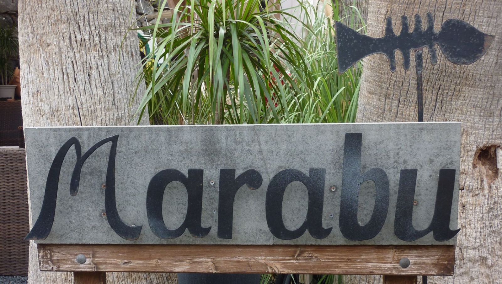 Wir gehen wieder zum Strand zurück und nach weiteren 150 m führt ein Trampelpfad steil den Hang hinauf. Linker Hand befindet sich ein Restaurant, wir gehen aber bis zur Asphaltstraße vor, um dort links in die Einbahnstraße zu gehen und ihrem Verlauf zu folgen, bis sie endet. Nach weiteren 70 m befindet sich auf der rechten Seite das (04) Restaurant Marabu (55 m).
