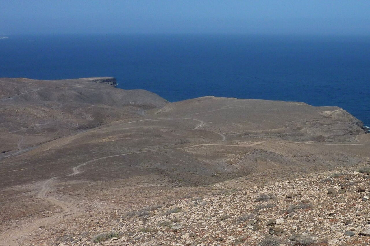 Nach einer Pause gehen wir im Barranco 330 m landeinwärts. Bei der ersten größeren Gabelung gehen wir im linken Barranco bergauf, um im weiteren Verlauf dann weglos zu einem (05) Schotterweg (70 m) aufzusteigen. Hier wandern wir rechts, lassen auf einer Anhöhe einen Abzweiger rechts liegen und steigen dann in das breite und sehr markante Barranco ab. Wir verlassen den Weg an dieser Stelle nach links und folgen immer dem Hauptstrom des Barrancos landeinwärts. Nach 1 km lassen wir das nach links abzweigende Barranco liegen. Als Orientierungspunkt dient uns nun der Hacha Grande, der halb rechts vor uns liegt. Das Barranco wird nun zunehmend schmaler. Die letzten 400 m gehen wir weglos bis zur Einsattelung, die wir ja schon vom Hinweg kennen. Der folgende Rückweg ist mit dem Hinweg identisch.