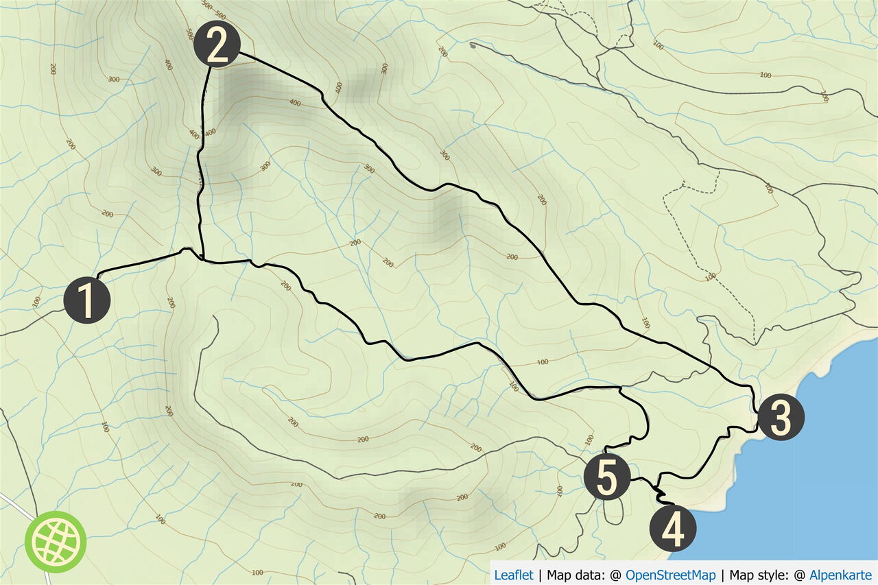 Als weitere Orientierungshilfe halten wir uns nun immer mittig auf dem Bergkamm, bis wir den Gipfel des (02) Hacha Grande (561 m) erklommen haben. Das Hacha-Grande-Gebirgsmassiv setzt sich aus 3 markanten Bergrücken zusammen, die aufeinander zulaufen. Über den Bergrücken aus südwestlicher Richtung sind wir aufgestiegen. In nördlicher Richtung führt ein Wanderweg nach Femès. In südöstlicher Richtung schlängelt sich ein Bergrücken bis an die Küste herunter.