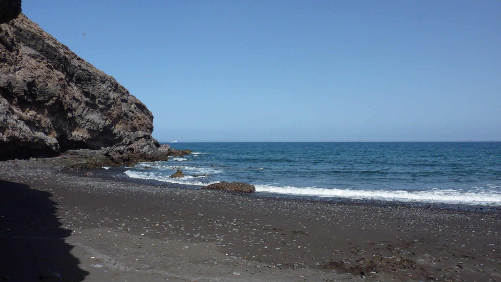 Wir gehen wieder 100 m in nördlicher Richtung im Barranco zurück. Links, in südwestlicher Richtung, steigen wir nun weglos auf. Wir befinden uns in einem Barranco mit schwarzem Lavastein und gehen dort weiter, bis wir oberhalb der Klippe ankommen. Halb links sehen wir nun einen großen Steinhaufen, auf den schon bald ein zweiter großer Steinhaufen folgt. Wir folgen dem eingeschlagenen Weg noch weitere 100 m und ändern dann die Richtung. Der Abstieg zum Strand ist an dieser Stelle nicht möglich, daher gehen wir zunächst für 130 m rechts, parallel zu dem vor uns liegenden Barranco. Dort angekommen, können wir in das Barranco absteigen. Der Abstieg ist jedoch steil, weiterhin weglos und erfolgt auf rutschigem Geröll. Sobald wir im Barranco sind, gehen wir links, sodass wir in seinem Verlauf bis an den (04) Traumstrand (2 m) Playa Ajaches Nationalpark 1 gelangen. Eine Bucht mit feinem, schwarzem Lavasand, durchsetzt mit kleinen Steinen, Schatten spendenden Stellen sowie perfekten Badebedingungen lädt zum Verweilen ein.