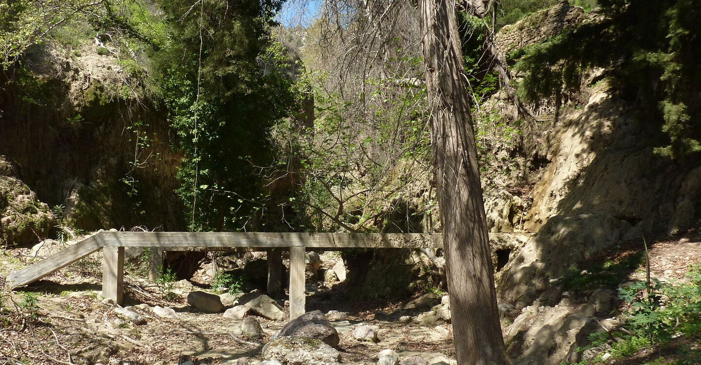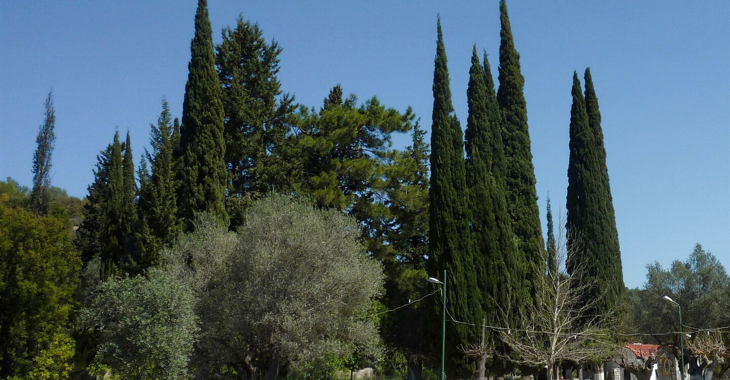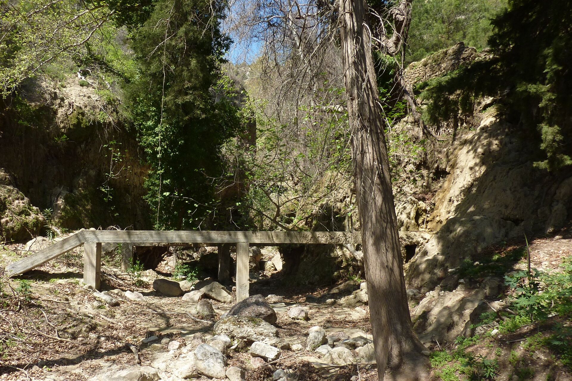 Bei mächtigen Zypressen erreichen wir die (02) Kapelle der Jungfrau Eleimonitria (98 m). Diese lassen wir rechts liegen und wandern auf der betonierten Piste bergauf. Es geht vorbei an einem Viadukt und weiteren Plantagen, tiefer in den sich verengenden Talkessel. An einer 180°-Kehre der Piste befindet sich am Wegesrand eine Metallstange. An dieser Stelle verlassen wir die Piste und gehen halb links auf dem Pfad weiter, der in kleinen Kehren bergab an Bewässerungsleitungen und Plantagen entlang verläuft.