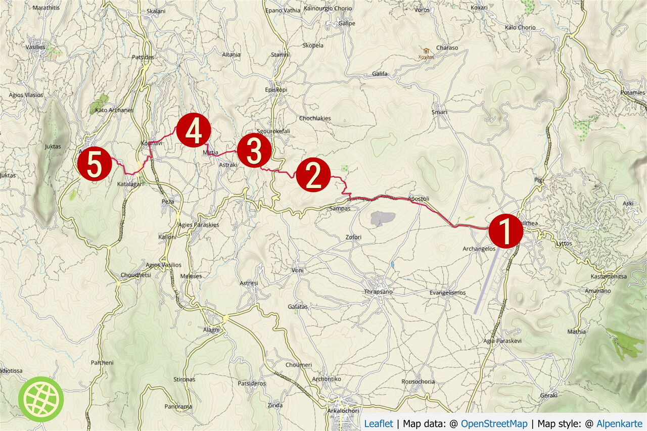 Vom Hotel in 01 Kastelli (275 m) gehen wir zunächst Richtung Ortskern, aber sobald wir die Apotheke auf der gegenüberliegenden Seite der Straße sehen, biegen wir scharf rechts in die ortsauswärts führende Straße ab. Schon nach 420 m gehen wir auf der größeren Straße halb links, verlassen diese aber bereits in der folgenden Linkskehre und gehen nun geradeaus. Wir treffen auf die Hauptstraße und begehen diese nach rechts. 520 m nach dem rechten Abzweiger Richtung Galfy biegen wir halb links auf die Piste ab. Die folgenden 3 Kreuzungen queren wir, bis wir wieder auf der Hauptstraße sind. 1,1 km nach einer rechts liegenden Kirche, eine Stromleitung verläuft hier rechts den Berg hinauf, gehen wir auf einer schmalen Piste rechts hinunter zu dem Olivenhain und dann weglos unter der Stromleitung, um nach 160 m der Straße rechts bergauf bis zu einer Kirche zu folgen.