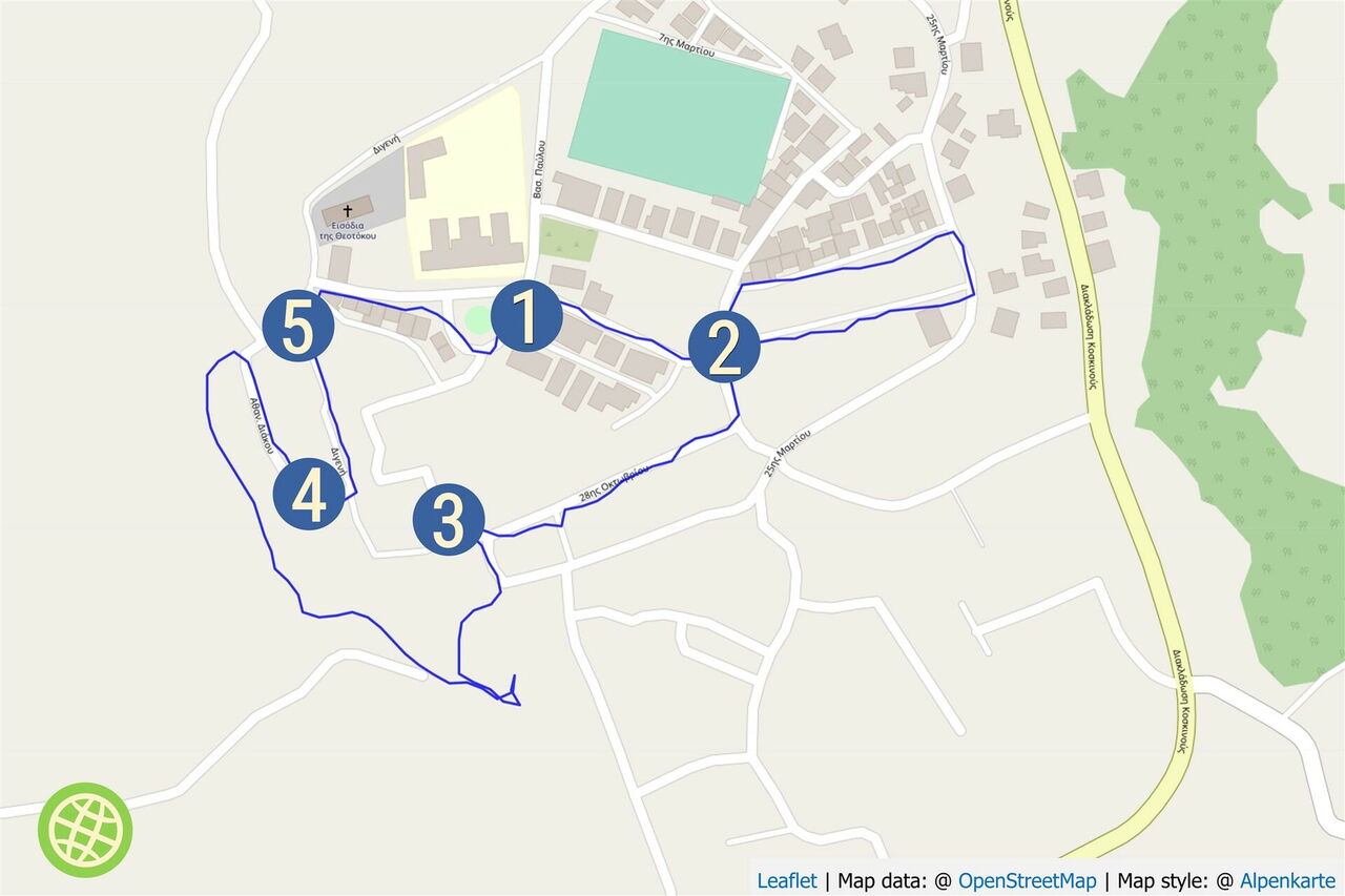Wir gehen nun am östlichen Ortsrand entlang des Geländers. Dieses leitet uns automatisch in eine weitere Gasse, die nach einer Rechtskurve in eine Straße mündet, auf der wir halb rechts ein Stück bergauf gehen und nun 80 m bis zur (04) Taverne (103 m) zurücklegen. Direkt dahinter befindet sich ein kleiner Platz. Bei dem Haus mit lila angemalten Türen und Fensterläden gehen wir links und nach 30 m gleich wieder links.