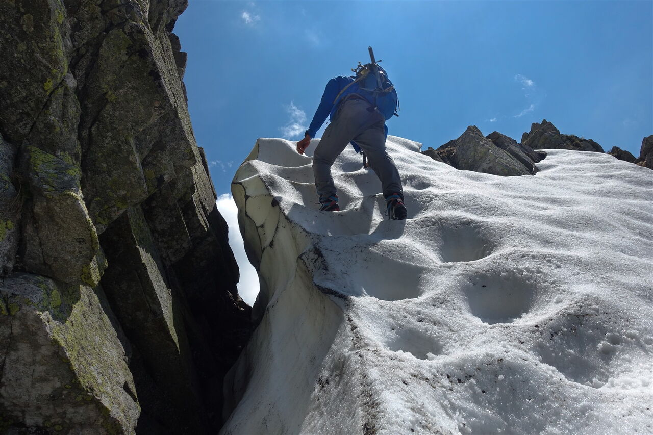 Notabstieg: Hinter der Einsattelung Przełączka nad Dolinką Buczynową führt links ein schwarzer Abstieg zur Hütte Schronisko PTTK Murowaniec. Nach 25 Minuten führt links ein grüner Steig bergab, auch dieser führt zur Hütte Schronisko PTTK Murowaniec. Weiter auf dem Höhenweg: Es erfolgt ein längerer Abstieg unterhalb des nördlichen Bergkamms, um dann rechts steil durch einen spektakulären Kamin aufzusteigen, den Komin pod Czarnym Mniszkiem. Wir erreichen den markanten Gipfel des 04 Skrajny Granat (2225 m). Hier beginnt dann ein luftiges Kletterabenteuer mit vielen ausgesetzten Passagen, Kettensicherungen und Eisenleitern. Der Klettersteig ist vorgegeben und bedarf keiner weiteren Erklärung. In den schattigen Lagen liegt noch bis Mitte Juni Schnee!