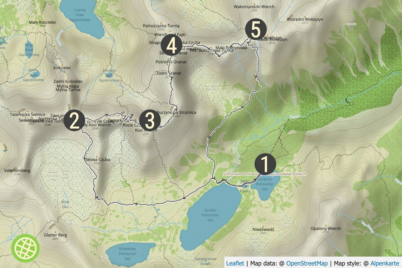 Start: Die Schronisko Górskie PTTK w Dolinie Pięciu Stawów Polskich (Fünf-Polnische-Seen-Hütte) ist nur zu Fuß erreichbar. Der Zustieg erfolgt über die Wanderung 65 in umgekehrter Richtung oder die Kombination aus den Wanderungen 62 und 63. GPS: 49.21355 20.048533.