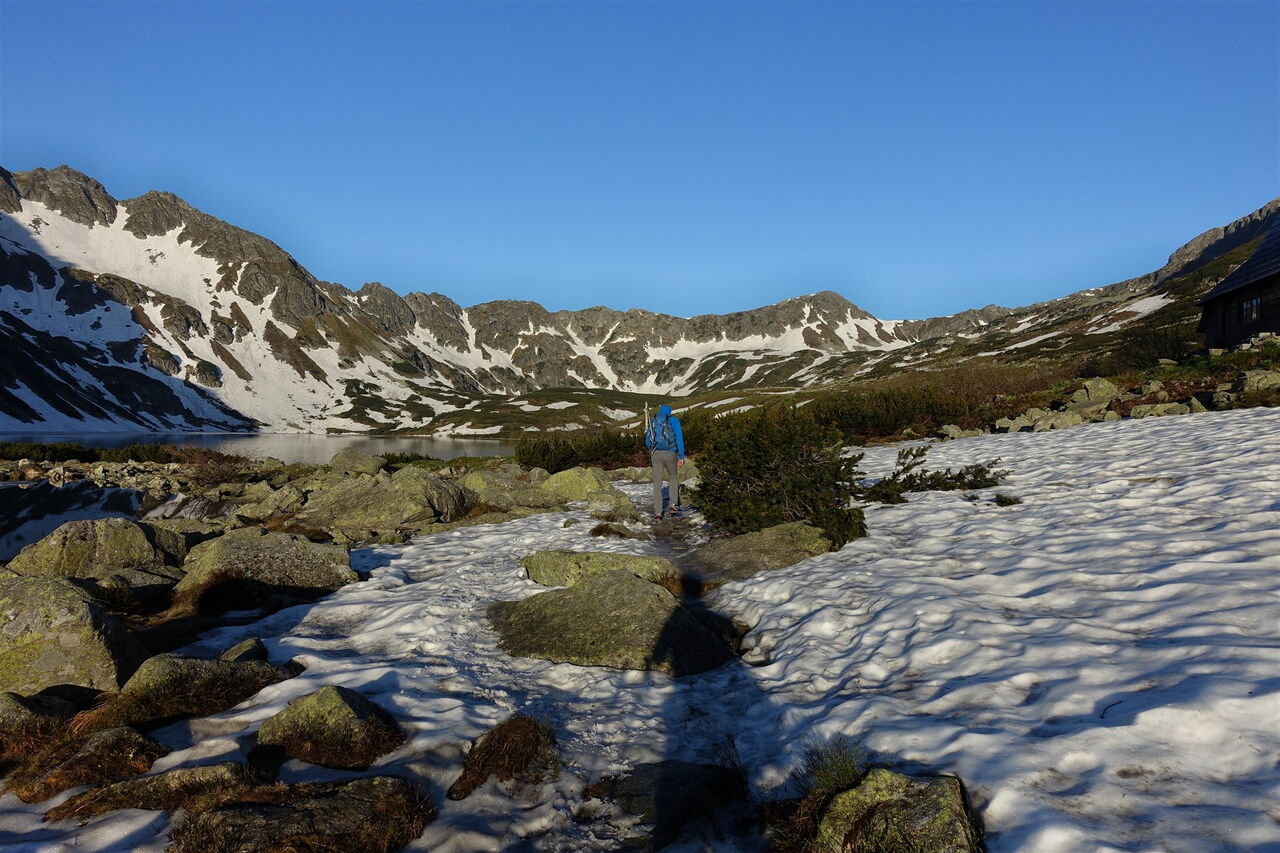 Von der 01 Fünf-Polnische-Seen-Hütte (1670 m) gehen wir in nordwestlicher Richtung auf dem blau markierten Wanderweg durch das Dolina Pięciu Stawów Polskich. Wir queren den Abfluss des Sees Wielki Staw Poliski und ignorieren die nachfolgenden drei Abzweiger (gelb, schwarz, gelb markiert), allesamt führen auf den Orla-Perć-Höhenweg.