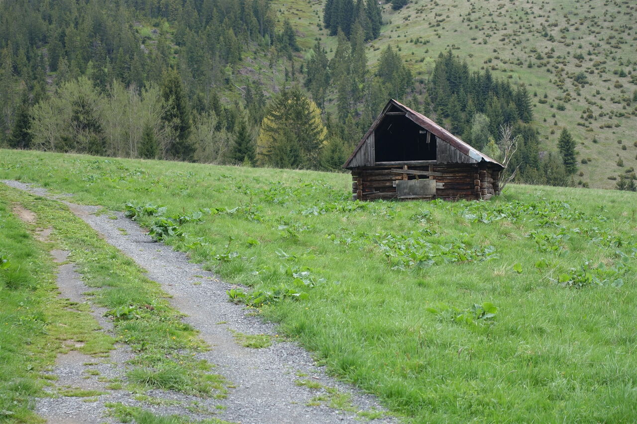 Nach kurzem Aufstieg sieht man bereits in der Ferne den Aussichtsturm 02 Rozhľadňa na Krajčovom vrchu (980 m). Nach einer Besichtigung gehen wir von dort auf einer Piste in westliche Richtung, rechts vorbei an drei verfallenen Ställen, wie sie überall auf den umliegenden Wiesen verstreut liegen – sie gehören zu den Besonderheiten der Region.