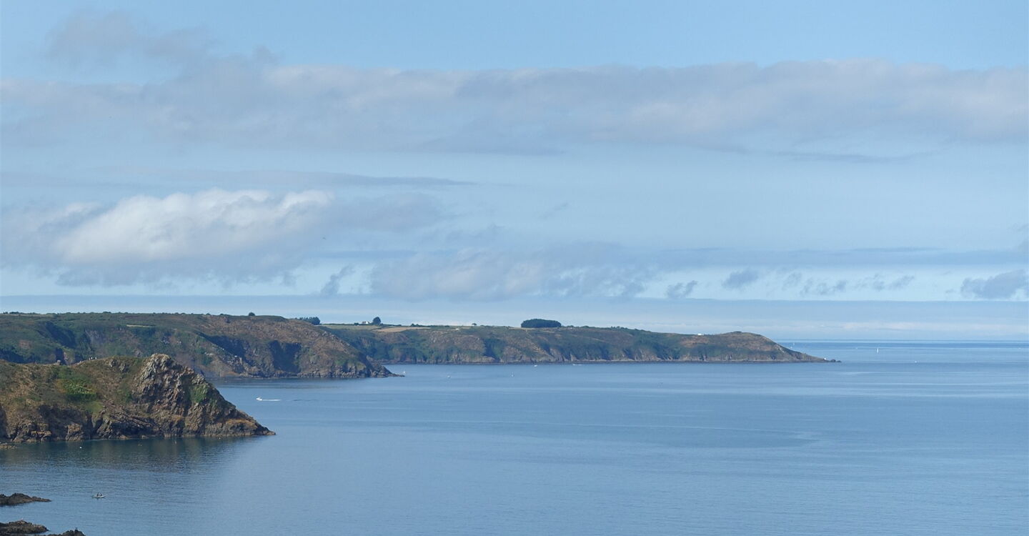 Bei der darauffolgenden Weggabelung gehen wir halb links und im weiteren Verlauf zunächst an Feldern entlang, dann durch ein kleines Waldstück und schließlich durch die Hortensienallee. Am Ende der Dreißigerzone – rechts geht es zur Pointe de Plouha – gehen wir geradeaus weiter. Dort, wo die Piste in die Straße mündet, gehen wir halb links. Sobald die Straße endet, gehen wir auf dem nachfolgenden Feldweg geradeaus weiter. Nach leichtem Abstieg gabelt sich der Weg, rechts geht es zum Plage Le Palus herunter, wir gehen halb links auf dem beginnenden Küstenpfad, dem GR 34. Nachdem wir mehrere steinige Buchten umlaufen haben, erreichen wir die 04 Pointe de Plouha (104 m), die höchste Klippe entlang der bretonischen Küste mit einem atemberaubenden Tief- und Fernblick.