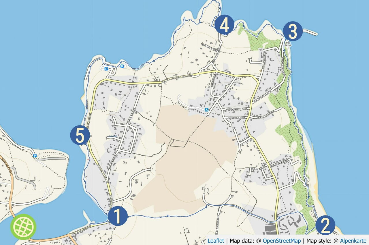 Auf der Straße gehen wir ein kurzes Stück des Hinwegs zurück und dann weiter geradeaus bis zum Ende der Straße – hier befindet sich ein riesiger Feigenbaum unter einer mächtigen Pinie. Wir gehen links an der Mauer entlang und folgen dem Zöllnerpfad. Dieser mündet in die Kehre einer Straße. Wir gehen halb rechts und in der nachfolgenden scharfen Rechtskurve der Straße gehen wir geradeaus auf dem GR34 weiter. Bei einer Hafenmole erreichen wir das nördliche Ende der Halbinsel, rechts befinden sich die große Bucht 03 La Lieue de Gréve (13 m) und ein kleiner windgeschützter Hafen, links der Plage de Beg Douar.