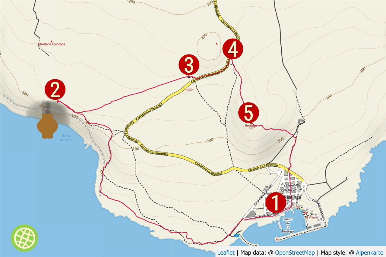 Vom Start und Ziel in (01) La Restinga (21 m) folgen wir der Einbahnstraße entlang der Promenade. Kurz hinter der Apartmentanlage Arenas Blancas endet die Straße. Wir gehen halb links auf der Schotterpiste weiter, um nach 150 m auf einem Trampelpfad in die Vulkanlandschaft einzutauchen. Es folgt ein Wirrwarr aus verschiedenen Pfaden, wir orientieren uns Richtung zweier Betonsäulen. Beim Näherkommen gehen wir auf die dem Meer abgewandte Säule zu. Wir kommen an einer kleinen Bucht vorbei und überqueren eine Anhöhe. Bald sehen wir zwei weitere Betonsäulen. Durch diese gehen wir auf einer gedachten Linie mittig hindurch, bis ein Weiterkommen aufgrund von zerklüfteten Gesteinsbrocken unmöglich ist.