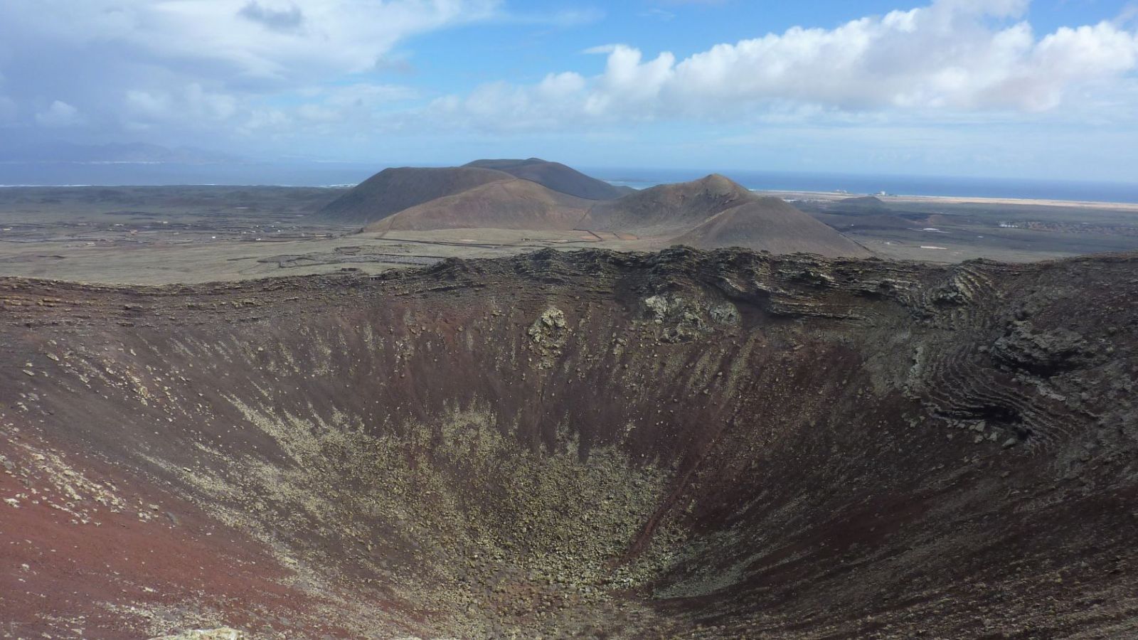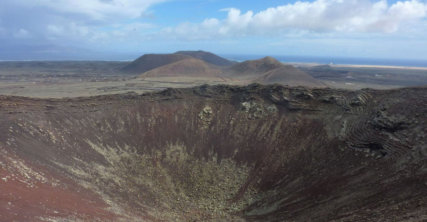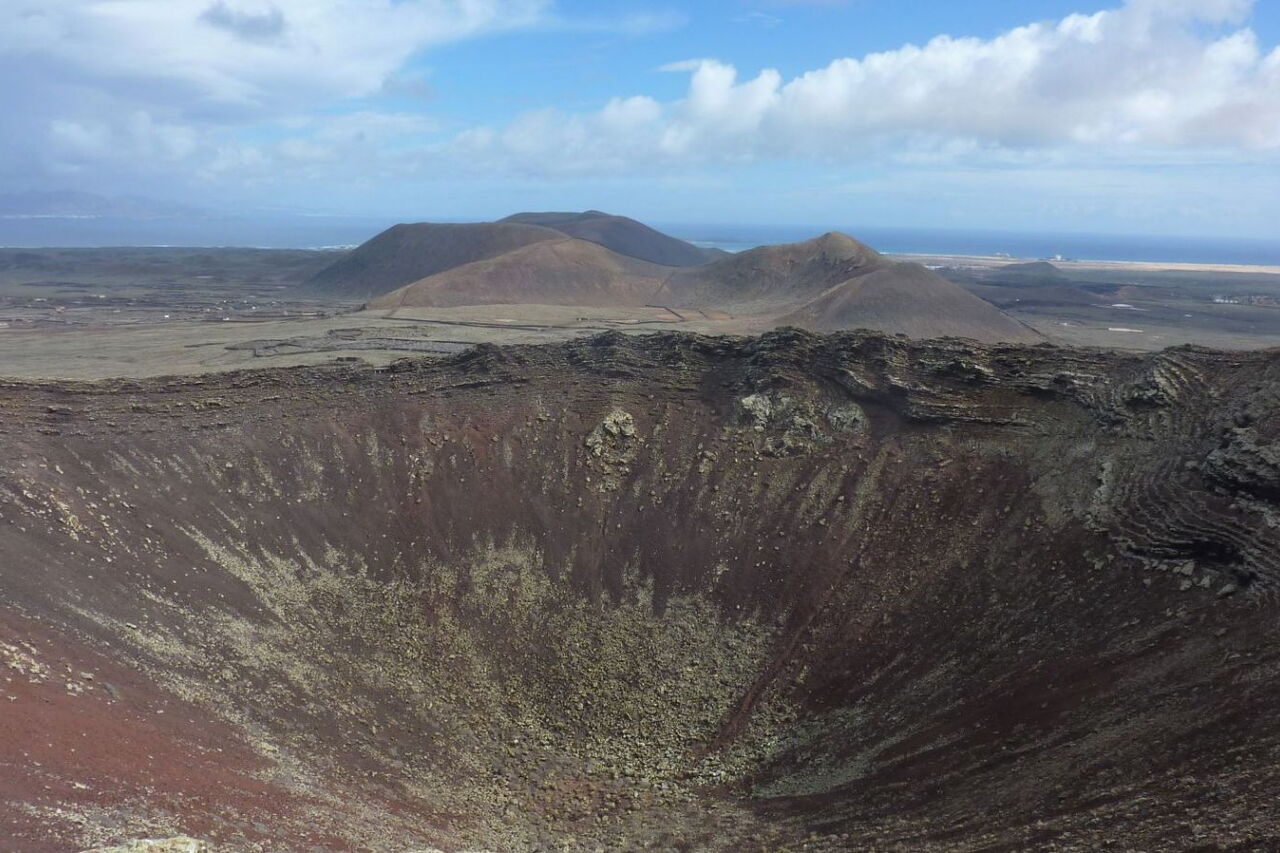 Bei Vulkanausbrüchen in dieser Region öffnete sich typischerweise die Erde in Längsrichtung und es bildete sich eine Reihe von Vulkanen. Das erste Teilstück der Wanderung verläuft parallel zu solch einer Vulkanreihe, bis wir von einer Aussichtsplattform direkt in den Vulkankessel der Calderon Hondo schauen können. Wer möchte, kann den Vulkan auf seinem Grat umrunden. Außerdem gibt es die Gelegenheit, Trockensteinbauten zu erkunden, wie sie von den Ureinwohnern Fuerteventuras gebaut wurden.