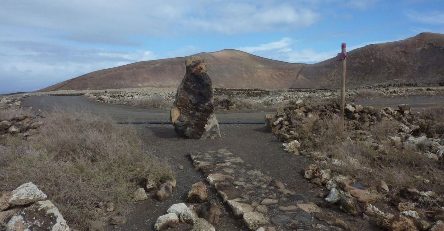 In östliche Richtung führt ein Pfad weg vom vereinzelt stehenden Gebäude, vorbei an brachliegenden Feldern, zu einem markanten aufrecht stehenden Felsen, den man schon aus der Ferne ausmachen kann. Wenn wir an diesem Stein auf der Schotterpiste links gehen, gelangen wir nach Corralejo. Wir gehen aber rechts in (04) Richtung Lajares (189 m). Nach 1,2 km auf der Schotterpiste gehen wir bei der folgenden Weggabelung erneut rechts. Nach weiteren 700 m verlassen wir den Hauptweg und gehen nun halb rechts auf dem Nebenweg weiter.
