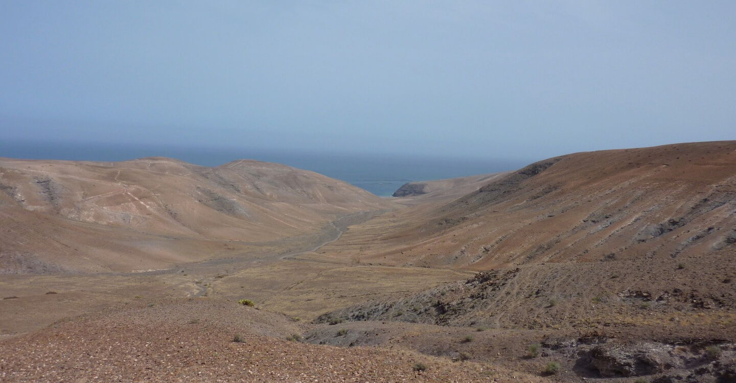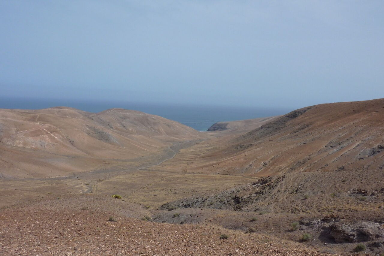 Wir haben das (02) Barranco de la Higuera (118 m) erreicht, einen der bedeutendsten Wasserläufe im Ajaches-Gebirgsmassiv. Sein Ursprung befindet sich zwischen den Erhebungen Pico Redondo und Loma Pico de la Aceituna. Es wird wieder ein Pfad erkennbar, dem wir fortan Richtung Meer folgen.