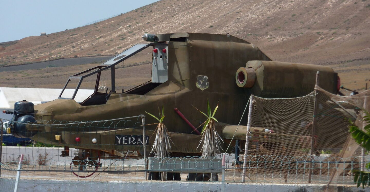 Mit der Buslinie 05 geht es von Arrecife nach Las Casitas de Femès. Mit dem Pkw beträgt die Strecke auf der LZ-2 und der LZ-702 22 km. Bereits in Las Casitas geht es vorbei an einem Hubschrauber - er steht im Vorgarten eines Hauses. Dann biegen wir bei der nächsten Möglichkeit links ab, um das Auto zu parken. GPS-Koordinaten 28.930283 -13.751083.