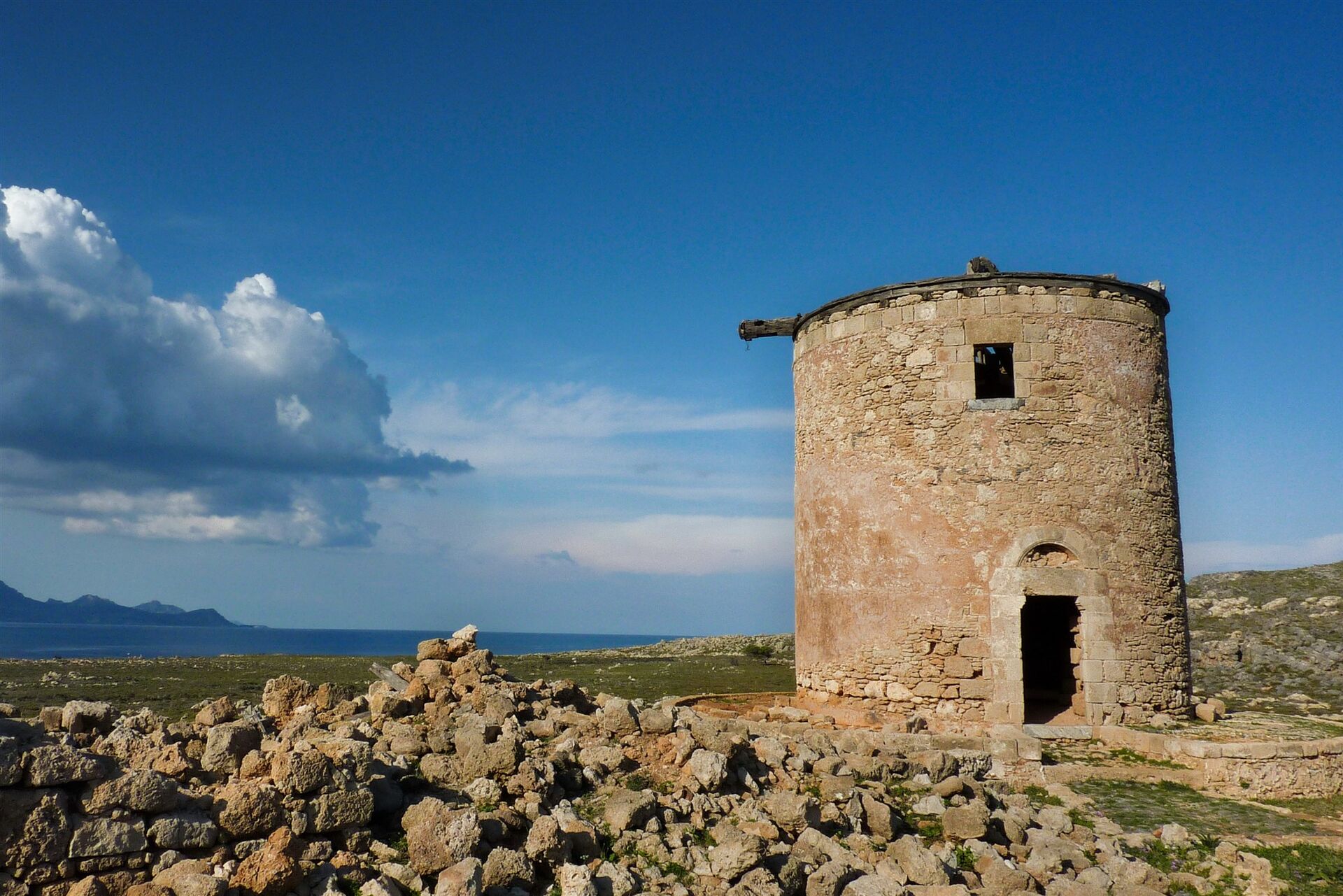 Beim Abstieg von dem Hügel folgen wir dem Pfad zu den Überresten einer (05) Windmühle (17 m). Nach einem Mauerdurchbruch treffen wir auf den Hinweg und gehen auf diesem bis zum Ausgangspunkt zurück.