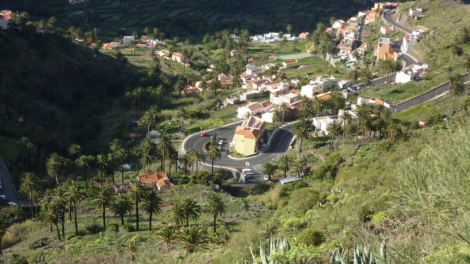 Der Weg endet und wir gehen auf dem nun breiten Wanderweg rechts bergab. Nach 300 m ergibt sich ein faszinierender Blick herunter in das (05) Valle Gran Rey (1015 m), in das 400 m tiefer liegende Barranco sowie links von uns auf die Fortaleza de Chipude. Der restliche Weg schraubt sich herunter Richtung Lomo del Balo, wo wir rechts auf der Asphaltstraße bis zum Ausgangspunkt gehen.