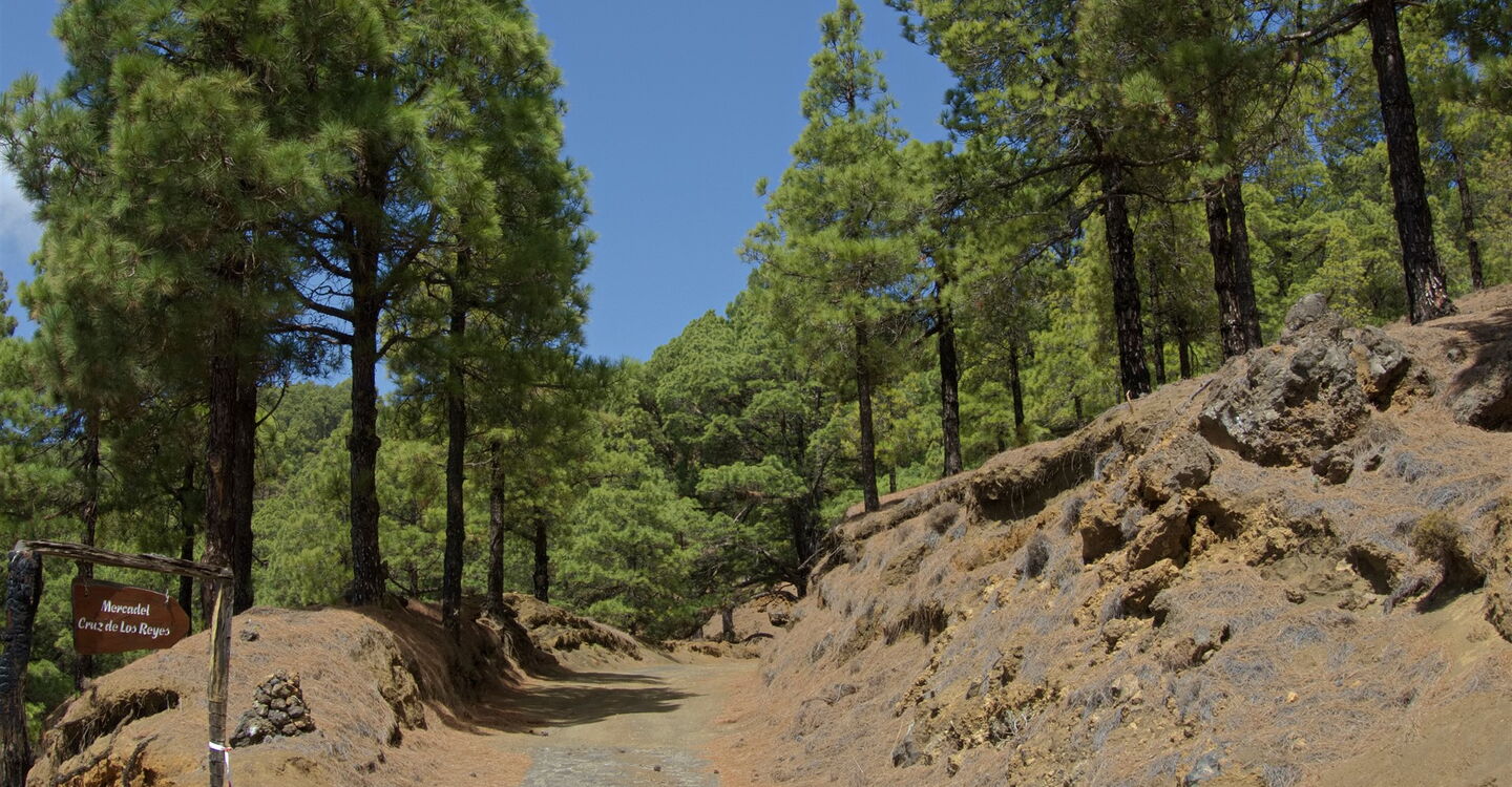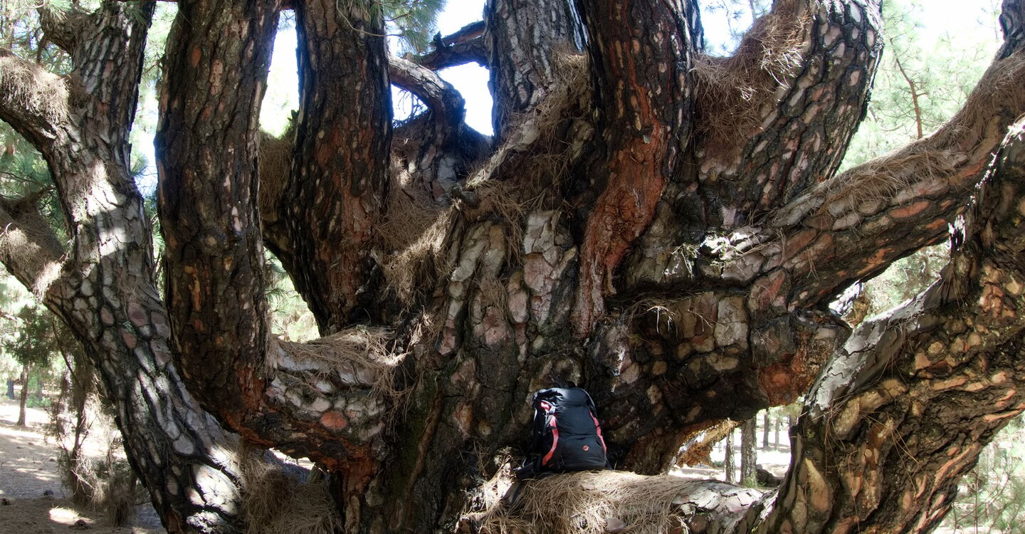 Kurz bevor unsere Piste in eine weitere mündet, führt auf der linken Seite ein Trampelpfad zur (02) ältesten Kiefer von El Hierro (1188 m). Aufgrund des langsamen Wachstums in dieser Region und eines unteren Stammdurchmessers von 2–3 m wird sie auf 400–600 Jahre geschätzt; ein wahres Juwel mit ihren tentakelartigen und mächtigen Ästen. Wieder auf der Forststraße wandern wir bei der Fuente de Julan auf dem rechten bergauf führenden Weg Richtung Cruz de Los Reyes und Sabinosa. Nach steilem Aufstieg erreichen wir eine Weggabelung. Hier nehmen wir den halblinken Abzweiger, kommen vorbei an der Fuente Cruz de Los Reyes und queren im weiteren Verlauf eine Straße. Bei der Dreiwegegabelung entscheiden wir uns für den mittleren Weg, der in Richtung der ausgeschilderten Parkplätze führt. Noch vor der großen freien Fläche orientieren wir uns rechts bergauf, um an der Asphaltstraße links zu gehen.