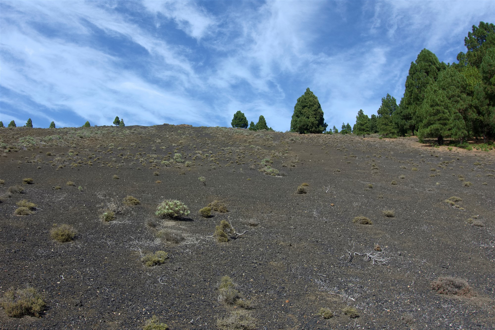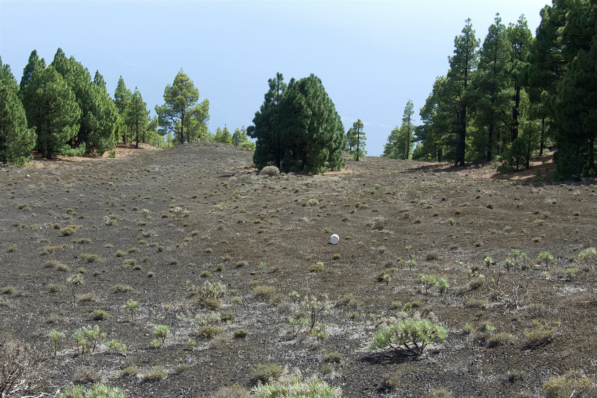 Nach nur 325 m, bei einem Holzpfeiler mit einer rot-weißen Markierung, (04) verlassen wir die Piste (1490 m), gehen weglos halb links über das Lapilli und orientieren uns dabei an einem kleinen Kiefernwald, sodass wir 50 m rechts neben den Kiefern ankommen. Falls wir zu weit links gegangen sind, muss die Wegrichtung noch ein bisschen justiert werden, denn dort befindet sich ein steiler Abbruch, den man bequem durch das weiche Gestein umgehend kann. Wir gehen schließlich 70 m nach rechts auf der Schotterpiste. Schauen wir den Abhang nach links herunter, so sehen wir eine große Freifläche mit Lapilli, die sich nach unten hin verjüngt.