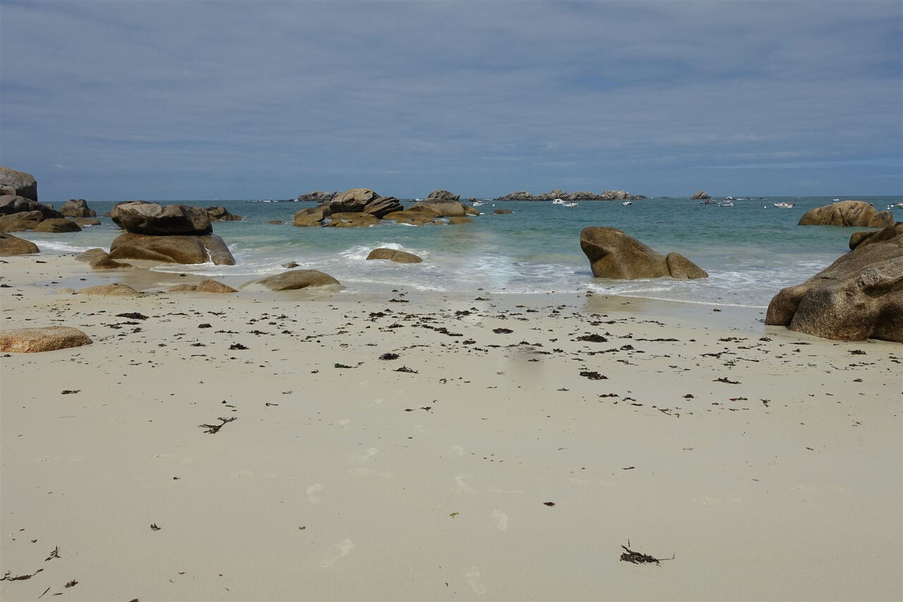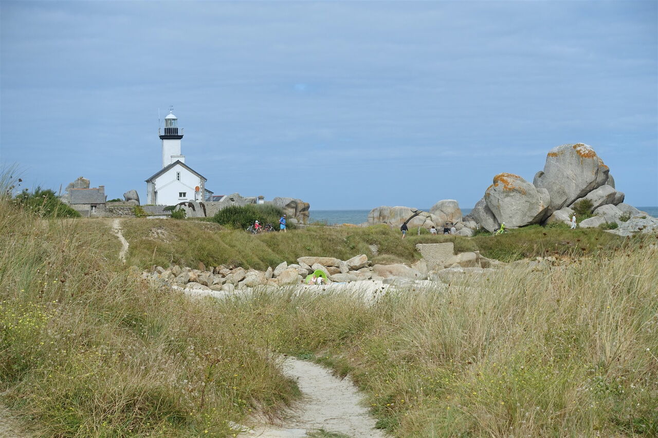 Gegenüber dem großen Parkplatz befinden sich das Museumsdorf und die Gaststätte 01 Auberge de Meneham (5 m). Wir gehen auf der Anfahrtsstraße landeinwärts in Richtung des riesigen Sendemasts. Anschließend ignorieren wir den linken Abzweiger und kommen vorbei an riesigen Felsen, die in den Vorgärten der Häuser stehen. Bei einem kleinen Wasserauffangbecken biegen wir halb links auf einen leicht ansteigenden Pfad ab, der durch die Felsen führt. Es geht an Einfamilienhäusern vorbei und bei dem gelben Haus mit roten Fensterläden halten wir uns links, wir gehen wieder auf einen riesigen Felsen zu. Dann laufen wir direkt über ein Feld auf einzelne Felsen zu. Halb links hinter der Straße befindet sich der weiterführende Pfad. Hinter einem weiteren Wasserauffangbecken mündet der Pfad in eine Straße. Dort, wo sie endet – bei einem steinernen Kreuz –, gehen wir links. Beim Vorfahrtsschild gehen wir dann rechts, bei der nächsten Möglichkeit links und an dem gelben Haus vorbei. Hinter einer weißen Schranke verlassen wir die Straße nach links und gehen auf dem Feldweg, bis wir bei der nächsten Weggabelung halb rechts gehen. Bei dem nächsten Abzweiger gehen wir links – hier befindet sich auch ein Holzpfeiler.