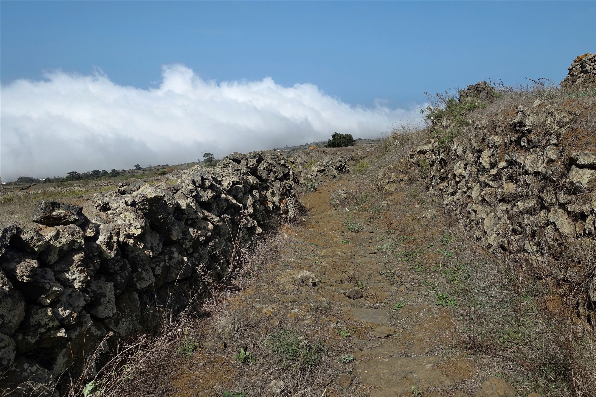 Die Meseta-de-Nisdafe-Hochebene ist in ihrem Wechselspiel aus verdorrtem Land in den Sommermonaten und fruchtbaren sattgrünen Weiden im Winter und im Frühjahr einmalig auf den Kanarischen Inseln. Sie liegt im Einflussbereich der Passatwolken, die zusätzlich in den Wintermonaten der Landschaft etwas Mystisches verleihen. Geht man in diesem wunderbaren Wandergebiet noch am oberen Rand einer 1100 m steil abfallenden Felswand, so sind dies die perfekten Zutaten für eine der erlebnisreichsten Wanderungen auf El Hierro. Ein Weg der Langsamkeit, um all die Eindrücke und Gedanken zu ordnen.