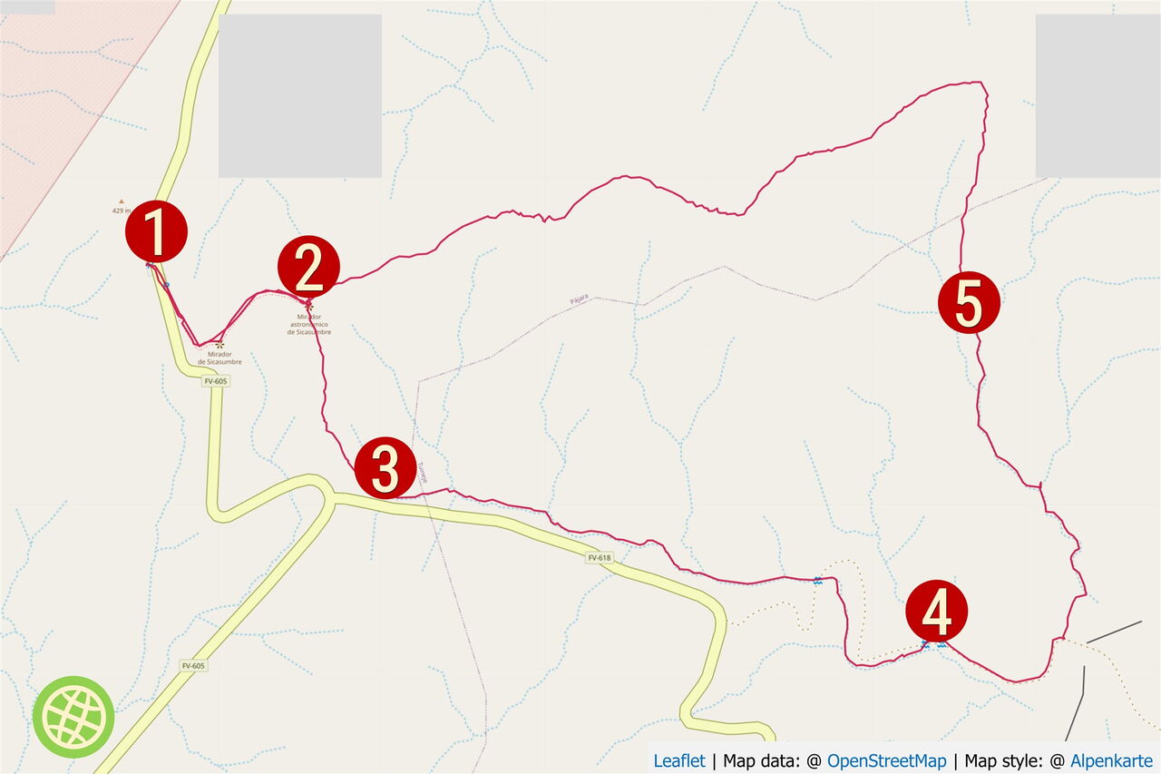 Nach einer bequemen Anfahrt und einem kurzen Anstieg erreicht man den Mirador astronOmico de Sicasumbre. Auf diesem ersten Wegstück geht es vorbei an interaktiven Informationspunkten. Besonders zu erwähnen sind die Erklärungen und Observationsgeräte zur analemmatischen Sonnenuhr. Danach folgt ein spannender Abstieg durch ein Barranco zu zwei künstlich angelegten Staustufen. Der Rückweg erfolgt über eine astreine Gratwanderung mit fantastischen Weitblicken.