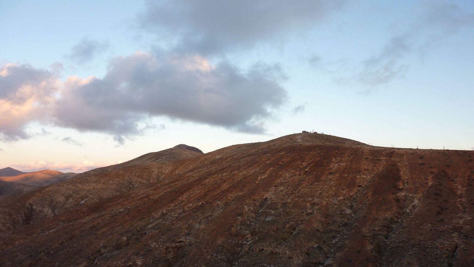 Nach nur 60 Höhenmetern und 410 m Entfernung ist bereits der Mirador (02) Astronomico de Sicasumbre (461 m) erklommen. Am Mirador aufgestellte Ziegenskulpturen des bekannten Bildhauers Juan Miguel Cubas ergeben das perfekte Szenario für ein Urlaubsfoto: im Vordergrund die Ziegen mit Familie und am Horizont die Jandia-Halbinsel mit dem gewaltigen Jandia-Bergmassiv. Am Mirador, direkt neben dem fest installierten Fernrohr und einem kleinen Steinhäufchen, führt auf dem vor uns liegenden Bergrücken ein schmaler Pfad in südliche Richtung talwärts.
