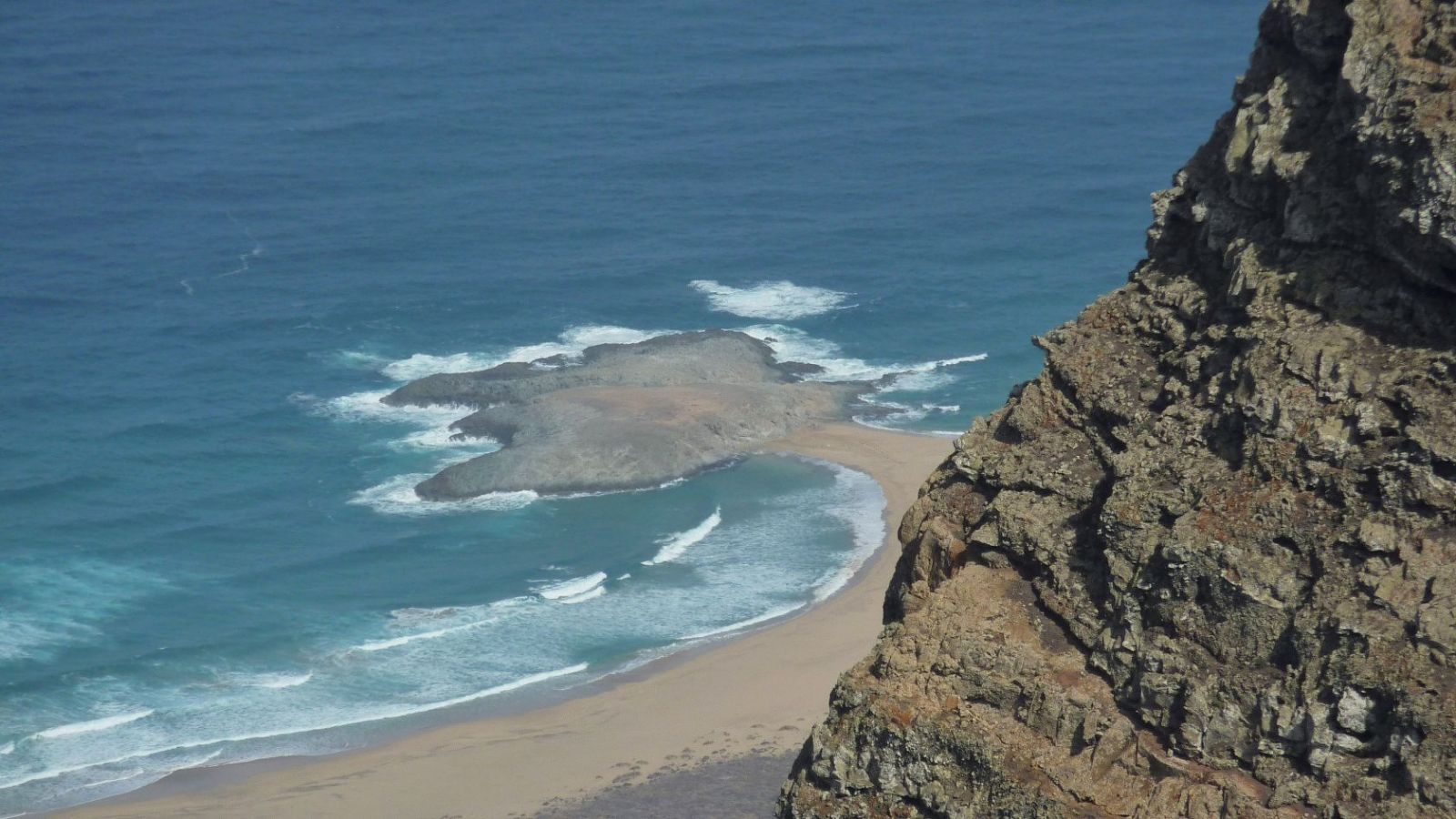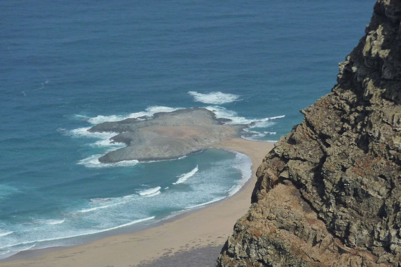 Wir erreichen den (05) höchsten Punkt (580 m). Wie aus einem Adlernest schauen wir herunter auf den 14 km langen Playa Cofete und Playa Barlovento, die von der Insel El Isolote getrennt werden. Rechts von uns erhebt sich der Gipfel des Morro del Cavadero (siehe Wanderung 44), weiter links die Montana Fraile (706 m) (siehe Wanderung 48). Wir gehen auf demselben Weg wieder zurück.