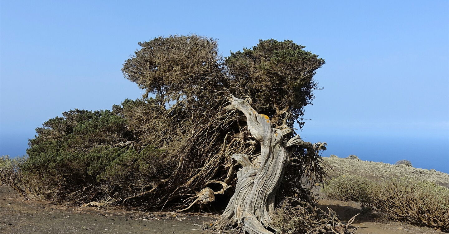 Wir erreichen den König aller (04) El Sabinar (601 m) – man schätzt sein Alter bis zu 1000 Jahre. Ab 9:30 Uhr ist die Sonne über die Berggipfel gestiegen und man hat sie im Rücken, um den König im vollen Glanz abzulichten. Wir nehmen dieselbe Strecke wie auf dem Hinweg bis zum Mauerdurchbruch.