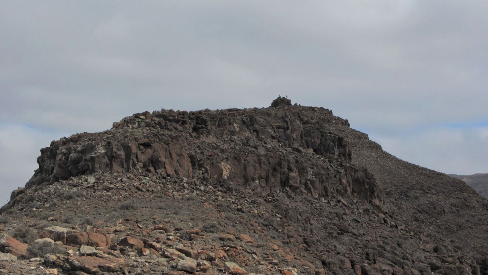 Es folgt ein weiteres Stück mit mäßiger Steigung, bevor der endgültige Anstieg bis zur (05) Montana Areguia (492 m) beginnt. Das Gipfelkreuz liegt etwas erhöht auf einem Basaltsteinkomplex. Die Aussicht unterhalb des Gipfelkreuzes ist einfach gigantisch. Der Blick von hier oben ist atemberaubend. Man schaut auf die wilde Westküste von Fuerteventura, weiter links erkennt man an den Sandfarben die Dünenlandschaft des Jandia-Nationalparks und am Horizont erheben sich die südlichsten Gipfel der Insel.