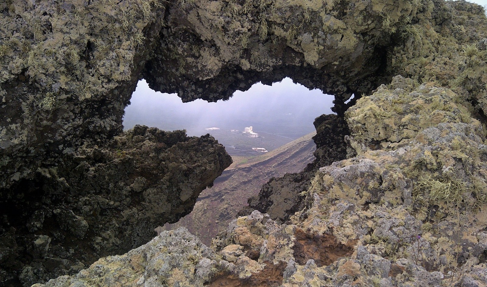 Wir erreichen einen kleinen (05) Felsdurchbruch (596 m). Wenn man hindurchschaut, sieht man in der Ferne den Herrensitz La Torrecella de Domingo. Wir gehen, teilweise am Kraterrand teilweise auf einer Trittspur, noch weitere 15 min, bis der Nordgipfel erreicht ist. Von hier aus gelangen wir in Kehren zum untersten Kraterrand. Das restliche Stück gehen wir auf dem Hinweg zum Ausgangspunkt zurück.