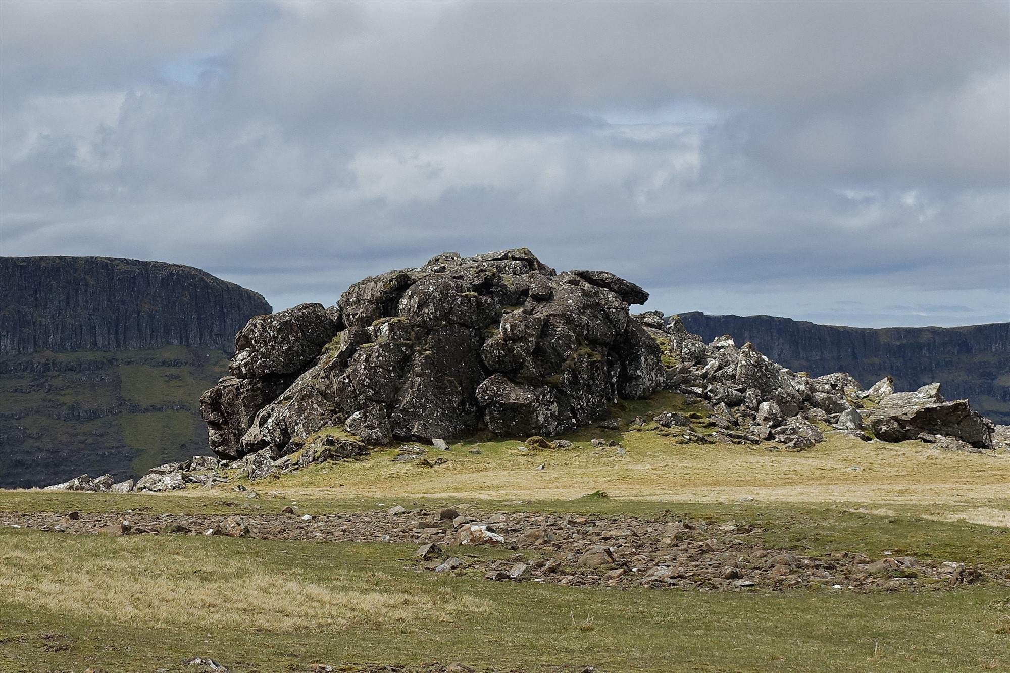 Dieser führt nun spektakulär entlang der Abbruchkante des mächtigen Erdrutschs vor 15.000 Jahren und gewährt faszinierende Tiefblicke auf den Old Man of Storr und seine Kinder. Während sich unterhalb an schönen Tagen die Touristenscharen drängen, steigen wir im Alleingang auf Grashängen bis zum Gipfel des 03 The Storr (719 m) auf. Während die felsige Ostseite des Gipfels gut 300 Höhenmeter senkrecht abfällt, sind das Gipfelplateau sowie seine Ostseite dagegen unspektakulär, leicht abfallend und mit Gras bewachsen. Ja, das Grün ist so kurz gehalten, dass man es als "Englischen Rasen" bezeichnen könnte, wären wir nicht in Schottland.