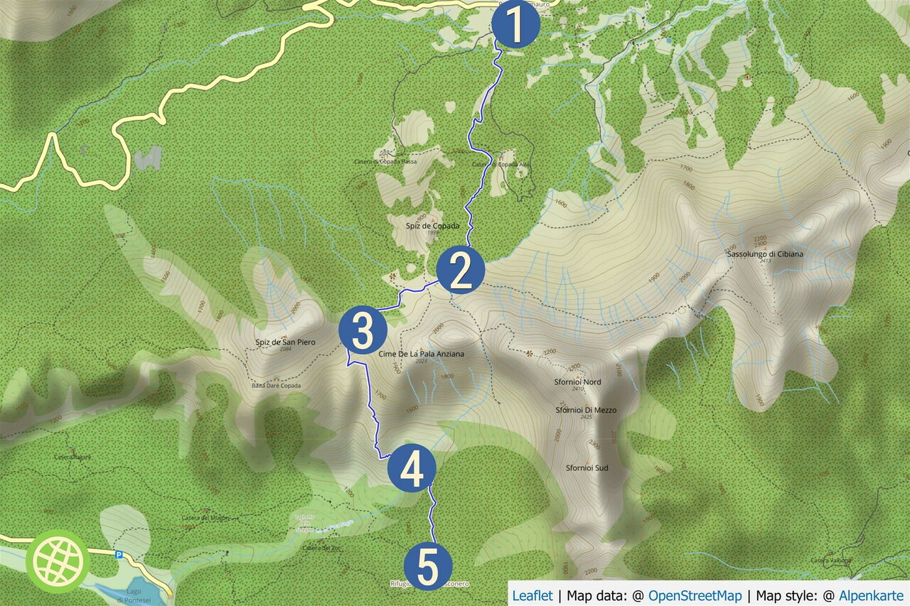 Südwestlich vom Passo Cibiana befindet sich in einer Stichstraße die Unterkunft 01 Baita Deona (1.530 m). Von dort überqueren wir in südlicher Richtung den dazugehörigen Parkplatz und gehen auf der darauffolgenden Forststraße bis zur nächsten Weggabelung. Hier orientieren wir uns nach halb links – Wanderweg 483 – und folgen zunächst der Ausschilderung Richtung Bivacco Campestrin. Wir ignorieren den nachfolgenden halb links abzweigenden Pfad zur Malga Copada Alta und gehen geradeaus weiter.