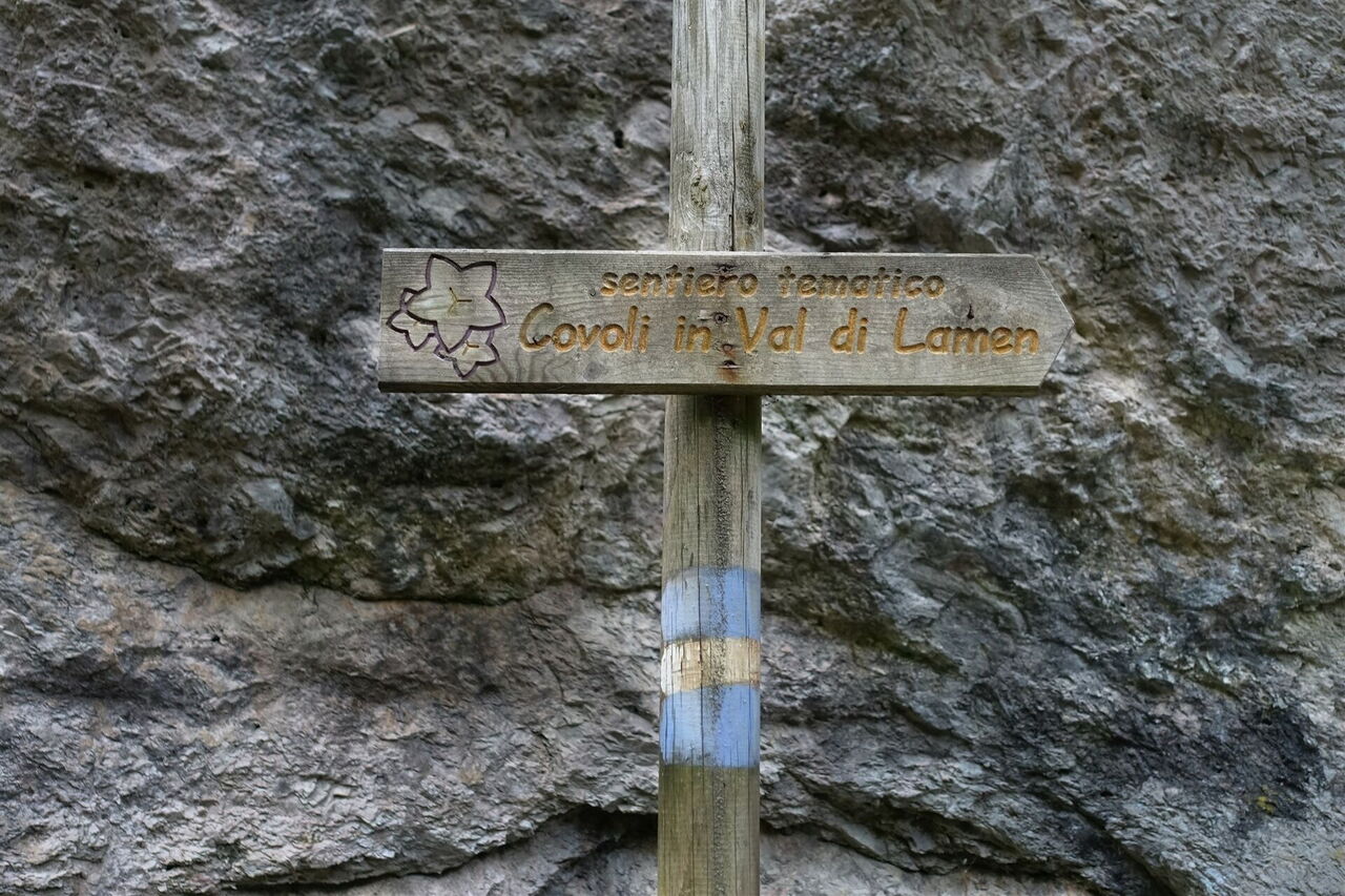 Dort, wo sich der Pfad gabelt, orientieren wir uns an dem halb rechts weiterführenden Pfad – rechts unterhalb befindet sich an dieser Stelle eine Schlucht. Bei einer romantisch gelegenen Casa, auf einer Waldlichtung gelegen, endet der Pfad und wir gehen auf der nachfolgenden Piste bergab. Von rechts mündet ein Weg in den unsrigen und nach wenigen Metern überqueren wir einen Bachlauf. Unsere Piste mündet in eine weitere Piste, auf der wir geradeaus weitergehen und abermals ein Bachbett queren. Bei einem Picknickplatz und Informationstafeln haben wir das 03 Val di Lamen (723 m) erreicht. Wer des Wanderns müde ist, entscheidet sich für die Variante (1) und geht rechts auf der Straße bergab.