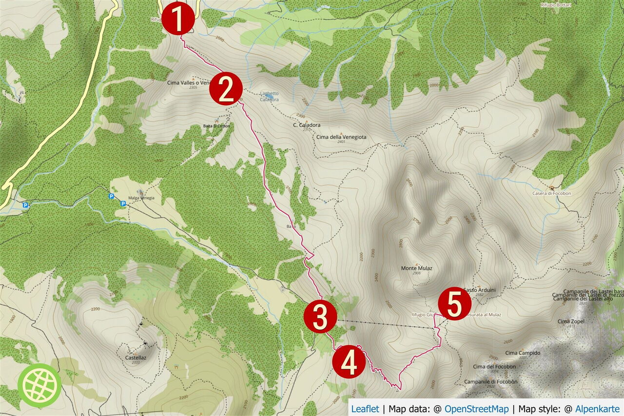 Die Besonderheit dieser Variante zur Etappe 12 von 21 (Tour 41): Wir steigen unterhalb der bizarren Felstürme der Pale di San Martino über den 2.571 m hohen Passo del Mulaz bis zum Rifugio Mulaz auf. Die Strecke ist ca. 35 Minuten, 1 km, 180 Höhenmeter bergauf und 200 Höhenmeter berab länger.