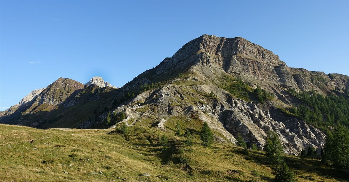 Nach kurzem Aufstieg gabelt sich der Pfad in zwei Arme, beide Wege sind zielführend. Wir erreichen die 02 Forcella Venegia (2.210 m) mit einem prachtvollen Blick auf die Palagruppe. An dieser Weggabelung mit einem Wegweiser gibt es die Möglichkeit, eine schöne Variante zu gehen. Anstatt dem Wanderweg 751 weiter zu folgen, überqueren wir die Forcella Venegia und gehen auf dem Wanderweg 749 durch Wiesen bergab, Richtung Pain della Vezzana. Den nachfolgenden rechten Abzweiger zur Malga Venegia ignorieren wir und bleiben auf dem Hauptweg.