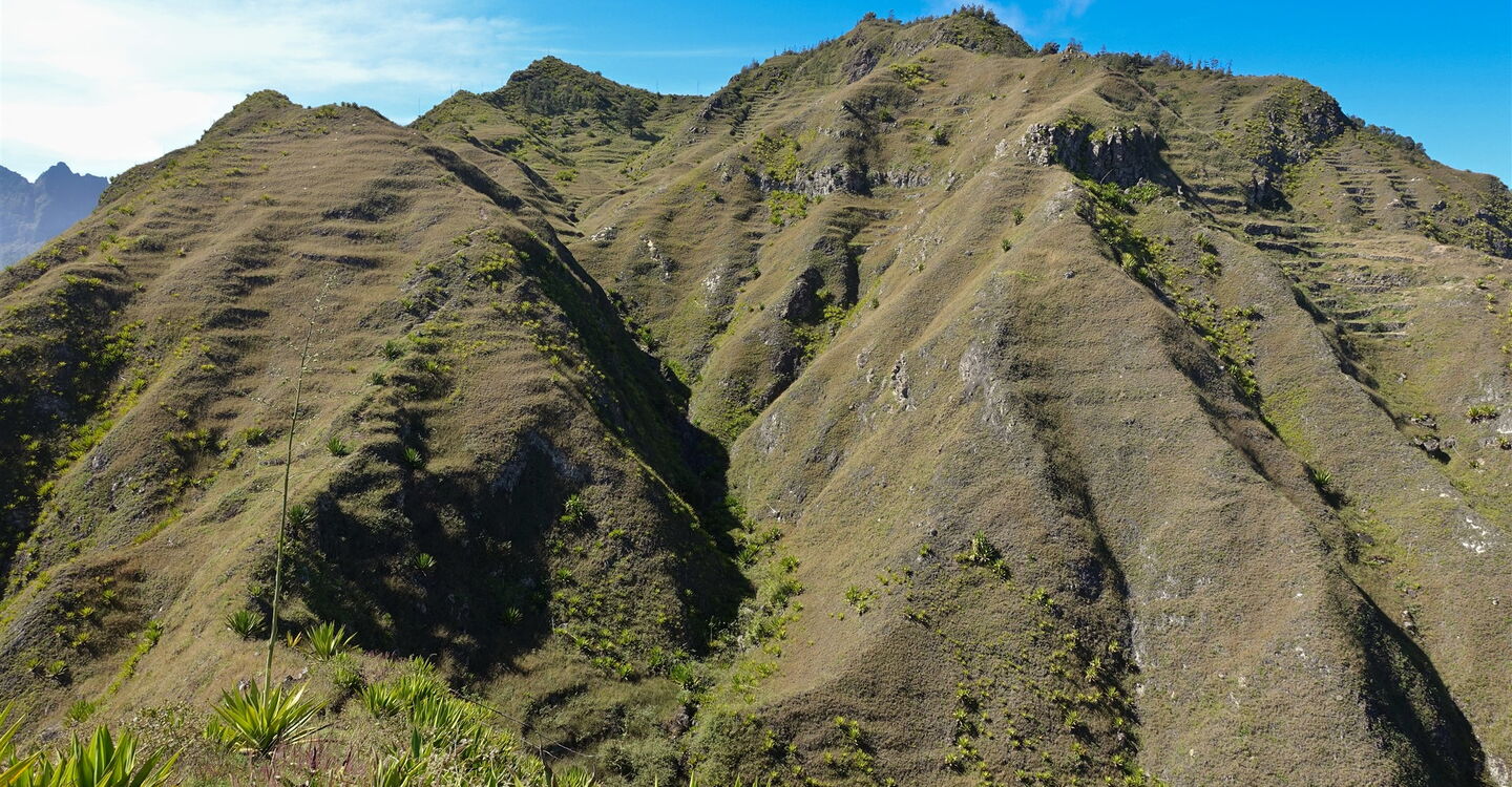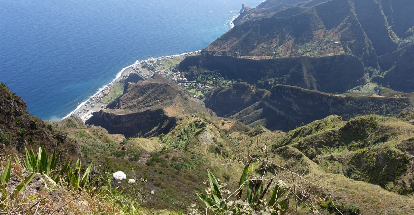 Aufgrund der einmaligen und atemberaubenden Blicke ins Tal und der Fernsicht entlang der Küste von Santo Antão, über das weite Rund des sattgrünen Figueiral de Paúl Tals bis zur bewaldeten Spitze des 1585 m hohen Pico da Cruz, gehört diese Tour zu den schönsten im Nordosten der Insel. Während sich im Tal Figueiral de Paúl das touristische Hauptgeschehen abspielt, wandern wir auf Routen fernab jeglichen Tourismus. Abschnittsweise führt der Pfad über einen ausgesetzten Grat eines Bergrückens, der bis zu 1000 Höhenmeter in den Talgrund abbricht. Man hat das Gefühl, man läuft auf einem Skywalk. Wir genießen Glücksmomente in luftiger Höhe.