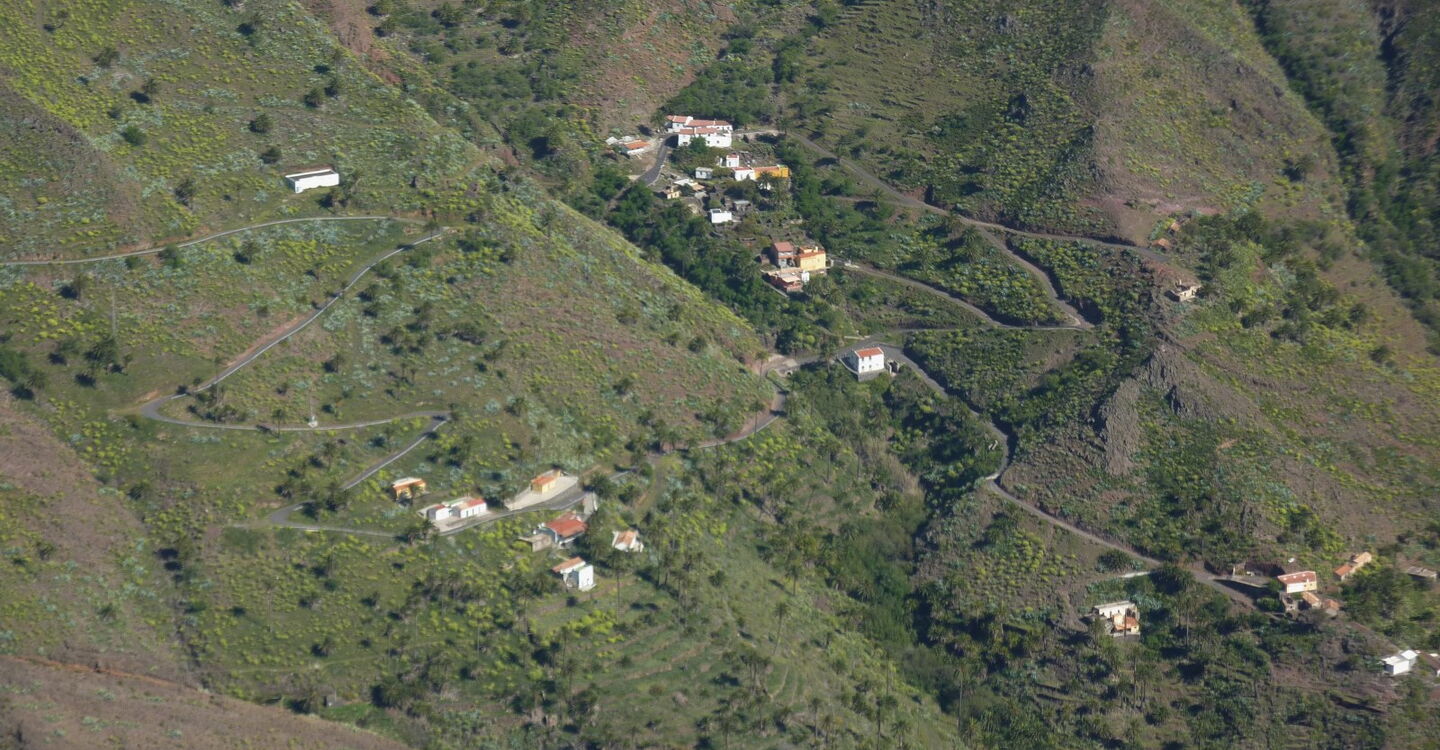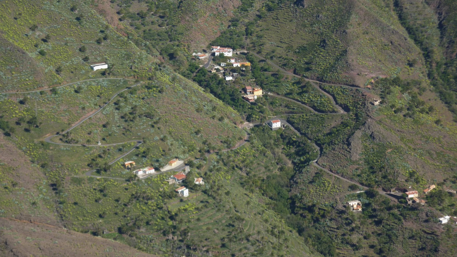 An dieser Stelle gehen wir ein Stück in das Barranco herein, um dann auf dem rechts beginnenden Wanderweg in engen Kehren aufzusteigen. Im weiteren Verlauf - teilweise ist der Pfad schwer auszumachen - überschreiten wir einige Bergrücken, bis wir links unterhalb von uns die Ortschaften Erque und Erquito sehen. Von der Kirche gehen wir rechts weitere 250 m auf der Asphaltstraße, um in der Rechtskehre der Straße links steil bergauf durch die Häuser aufzusteigen. Wir queren das Barranco nach halb links und nehmen den beginnenden Wanderweg bis zur 70 m entfernten (03) Weggabelung (775 m).