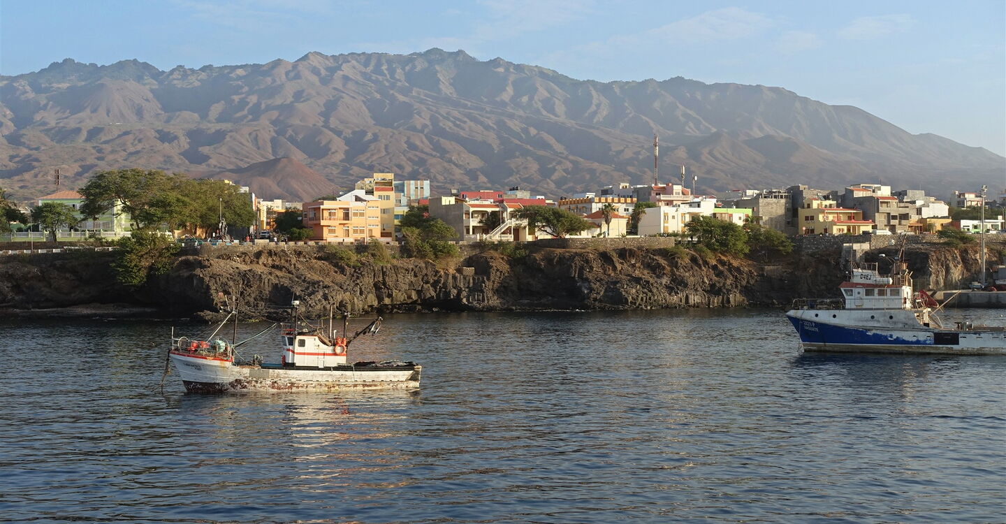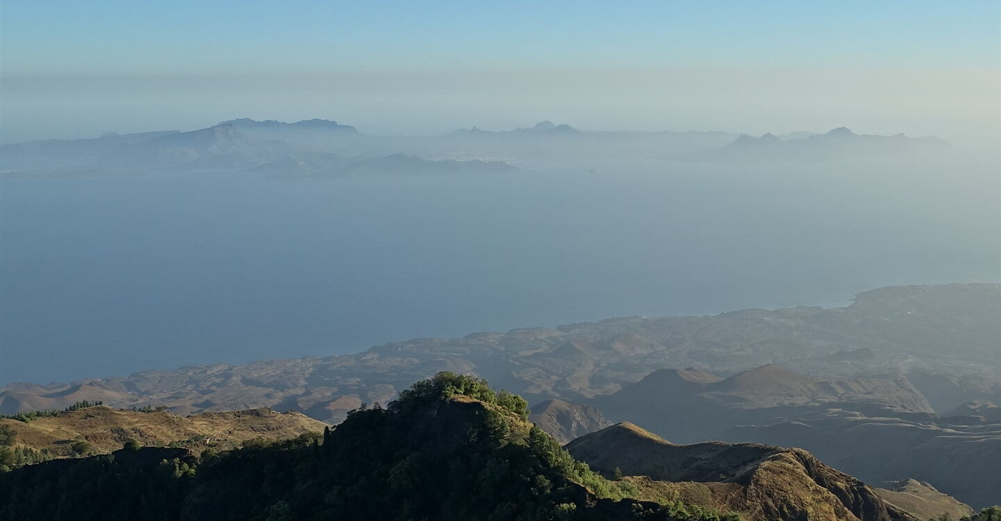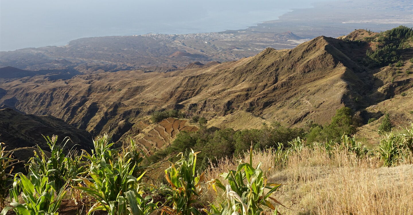 Der Abstieg ist eine Erlebniswanderung durch die Vegetationsstufen der Insel. Vom Bergdorf unterhalb des Gipfels des 1585 m hohen Pico da Cruz, mit seinen oft tropfenden Nebelwäldern, steigen wir zu vereinzelten Gemeinschaften der Kapverdischen Wolfsmilch ab. Unterhalb von 700 Höhenmetern gelangen wir dann in eine savannenähnliche Landschaft mit Akazien. Der verbleibende Caminho zum Hafen führt vorbei an verdorrten Feldern und schwarzem Lavagestein, das im krassen Farbkontrast zu dem erfrischend wirkenden und dunkelblauen Atlantischen Ozean steht. In den Morgenstunden kann man bei gutem Wetter und klarer Luft die Struktur der Landschaft über die gesamte Länge der Insel perfekt nachverfolgen. Dabei sieht man den einen oder anderen bestiegenen Gipfel, die damit verbundenen Emotionen kann man Revue passieren lassen.