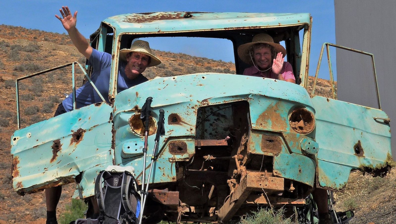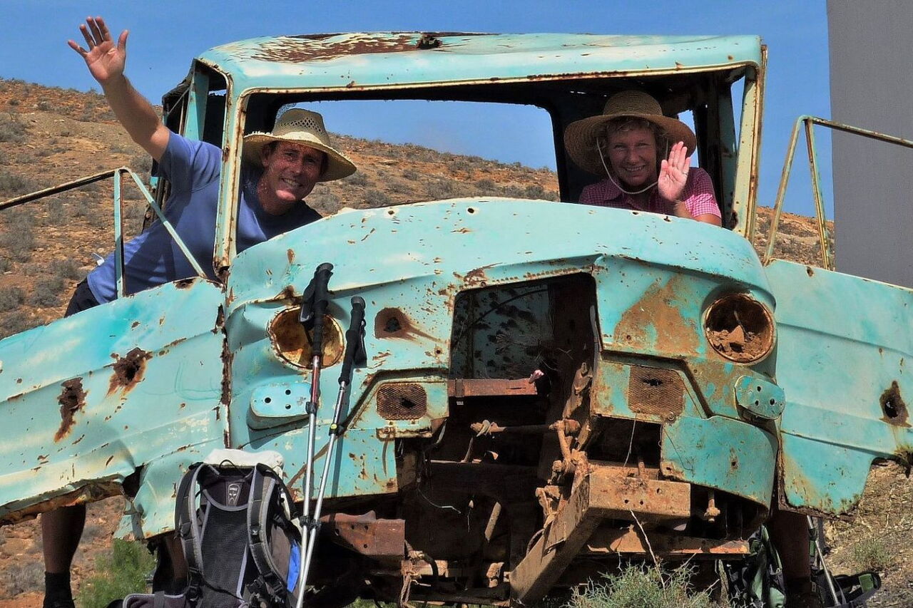 Der Abstieg erfolgt Richtung Norden über die Steinmauer. Wir gehen rechts in nordwestlicher Richtung an dieser Mauer entlang und halten uns nach 220 m halb links, um nicht in das rechts von uns liegende Barranco zu geraten. Auf diesem weglosen Stück halten wir uns immer in 30-50 m Entfernung vom Barranco. Schon bald sehen wir auf der rechten Seite Terrassenfelder. In der Verlängerung der gedachten Achse beginnt eine Schotterpiste, auf der wir weiter taleinwärts laufen. Auf diesem Weg erreichen wir Betancuria. Lohnend ist der Abstecher rechts herunter zu einem Friedhof und einem sehr originellen (05) Schrottwagen (439 m), der zu lustigen Fotomotiven einlädt.