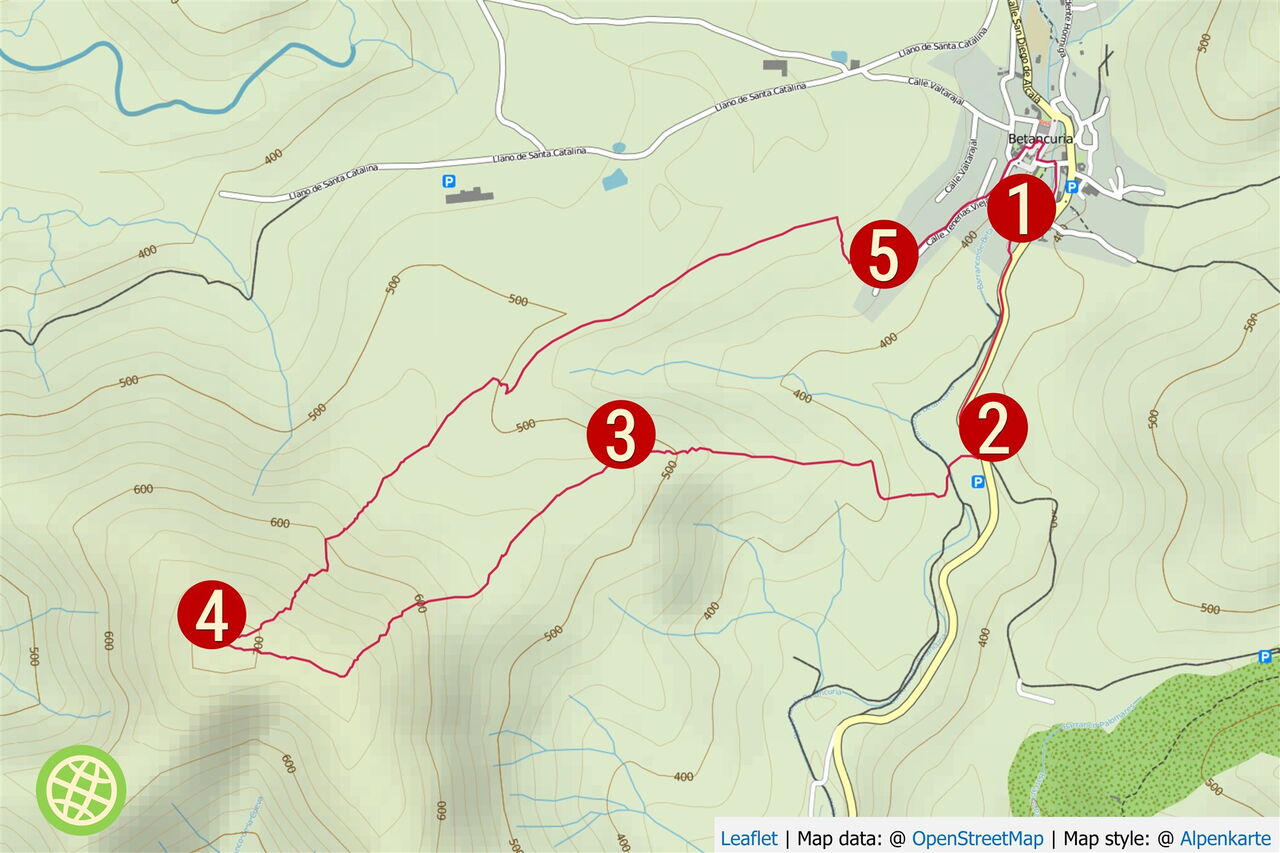 Vom Parkplatz am (01) Start und Ziel (360 m) gehen wir in südliche Richtung auf der Hauptstraße Richtung Pajara. Hinter einer Linkskehre verlässt eine Straße die Hauptstraße nach links.