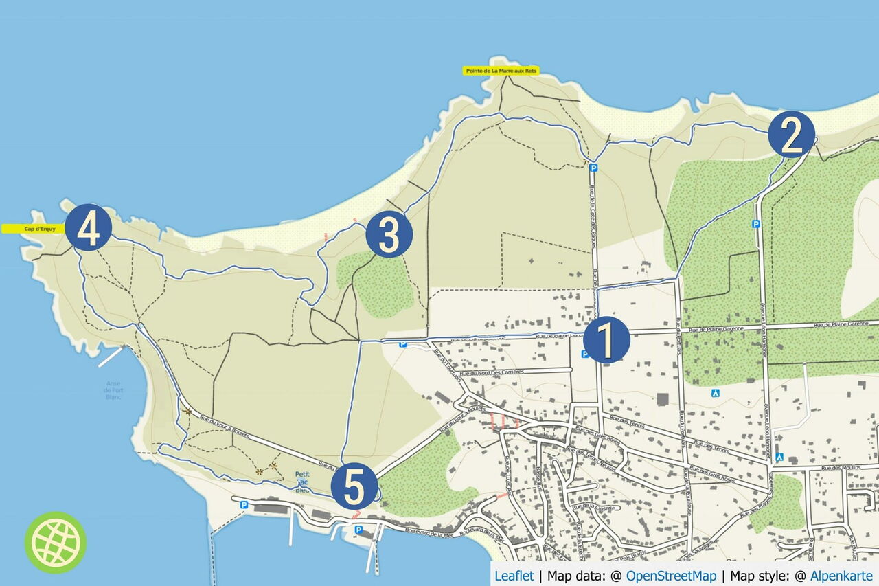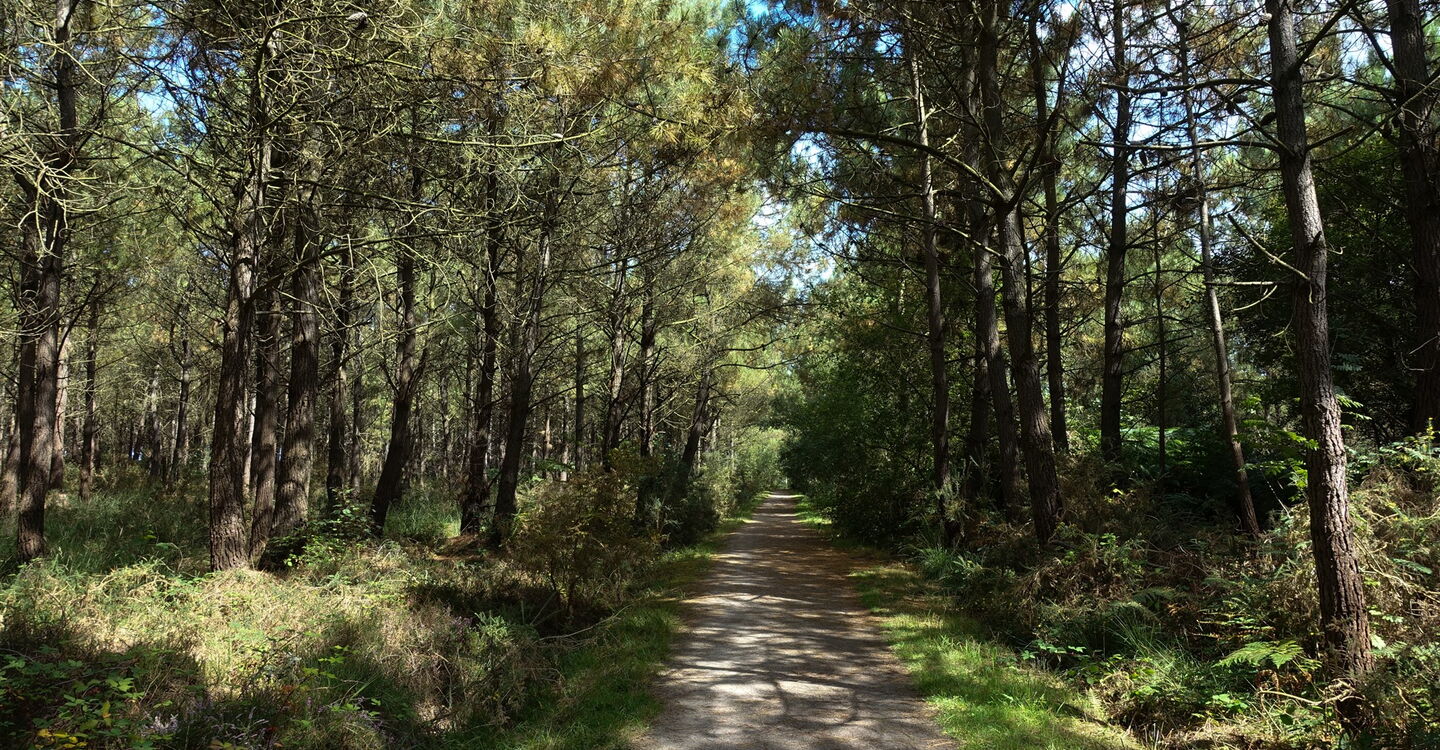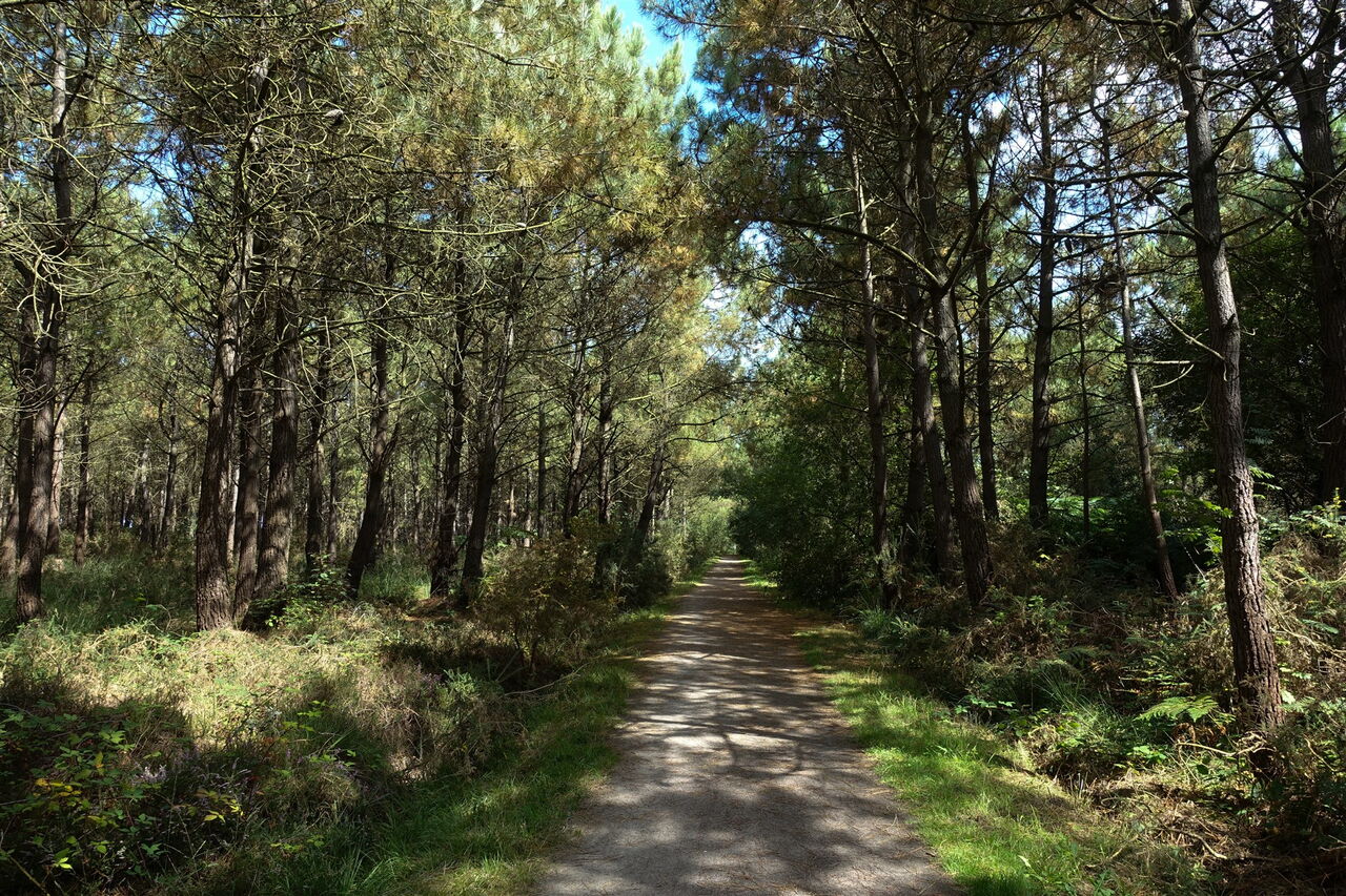Vom 01 Start und Ziel (54 m) gehen wir in nördliche Richtung auf der Rue de la Côté des Pâques und am rechts von uns liegenden Campingplatz entlang. Bei der nächsten Möglichkeit, am Ende des Campingplatzes biegen wir rechts in die Sackgasse der Chemin de la Côte du Haut ab. Am Ende der Straße gehen wir links und bei der sofort darauffolgenden Weggabelung halb rechts durch einen lichten Kiefernwald.
