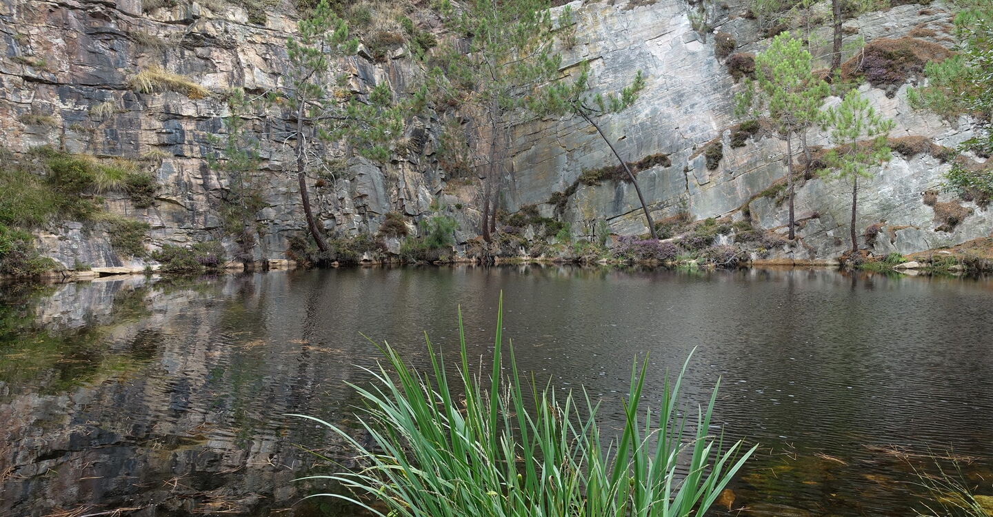 Wir wandern auf einem aussichtsreichen Pfad oberhalb des Hafenbeckens, linke Abzweiger ignorieren wir. Hinter einem kleinen See und einem Treppenaufstieg folgt der zweite der sogenannten 05 Lacs Bleus (48 m). Diese sind keine kreative Schöpfung der Natur, sondern Reste alter Steinbrüche aus rosafarbenem Sandstein, die malerisch von einem Pinienwald umgeben sind. Bis 1930 wurde hier Kopfsteinpflaster aus dem Fels geschnitten. Der Pfad mündet in eine Straße, auf der wir links gehen. Kurz später überqueren wir die Straße, um halb rechts an der Holzbarriere vorbei auf den nachfolgenden Weg zu gelangen. Bei im Weg liegenden Felsen endet der Weg, wir gehen rechts und erreichen die Straße. Auf dieser gehen wir geradeaus bis zum Parkplatz auf der rechten Seite.