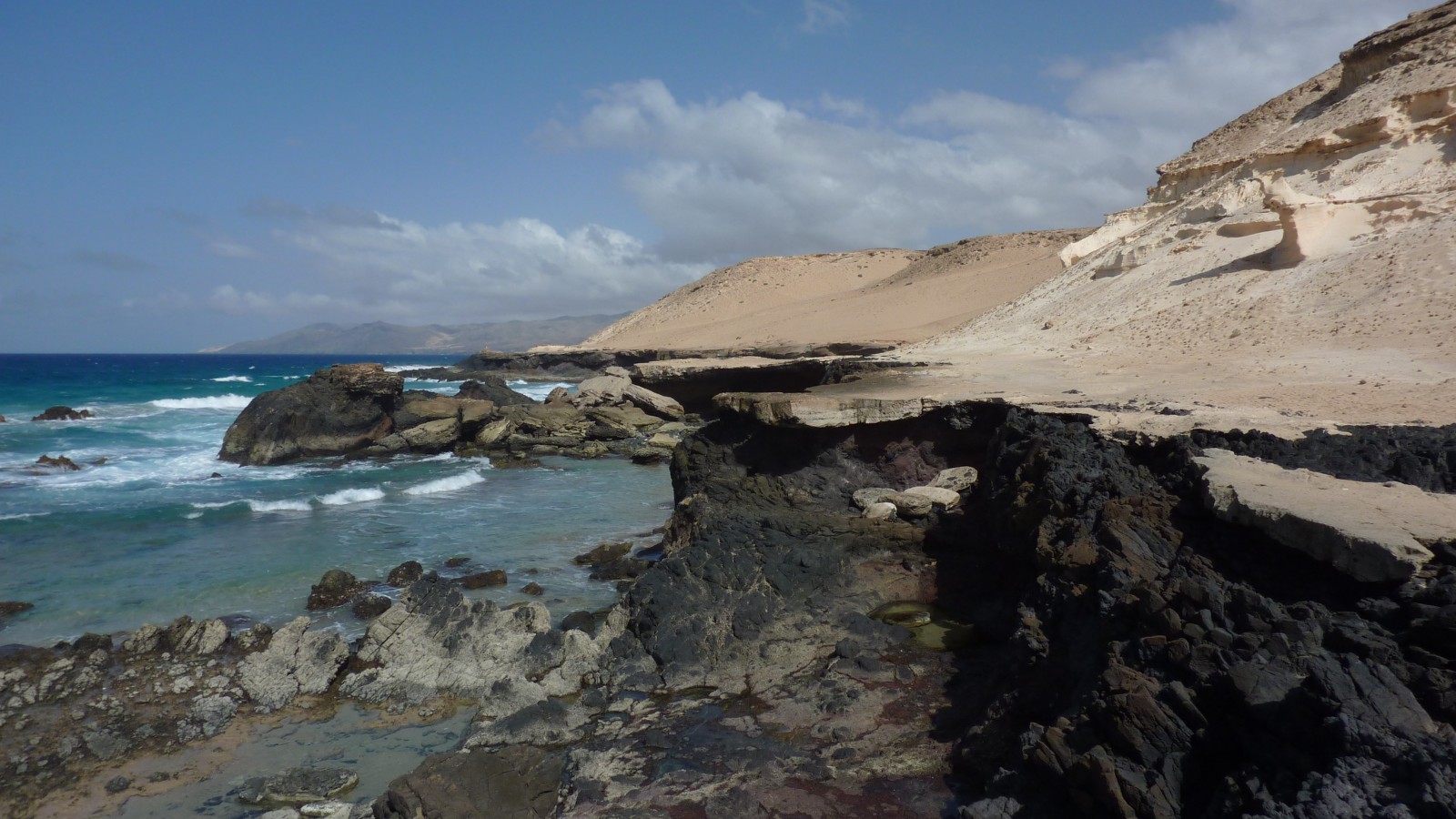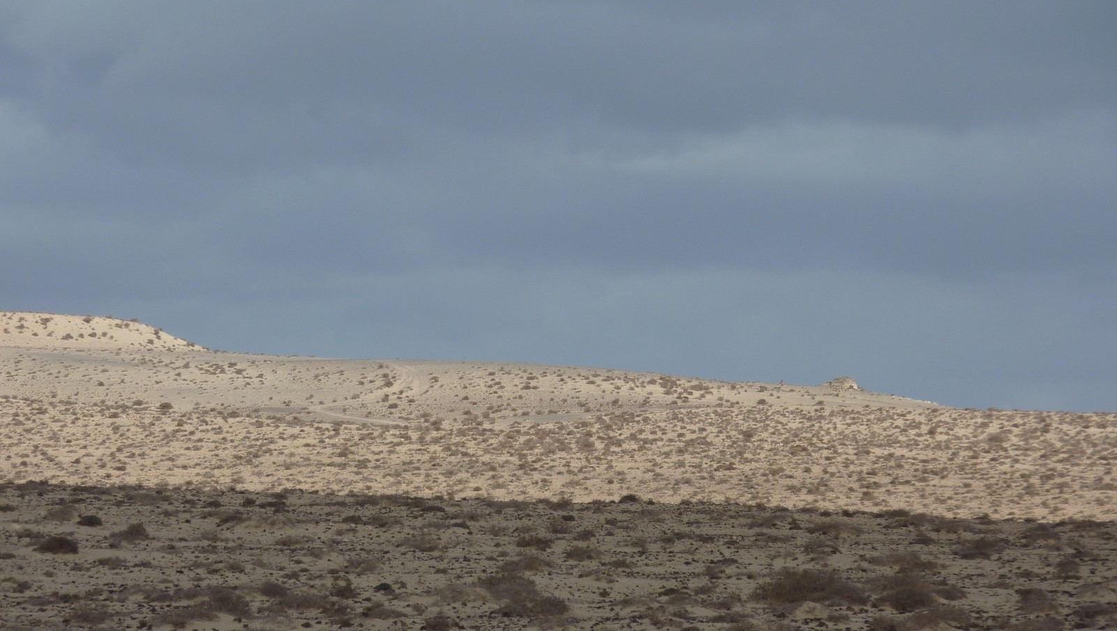 Wir starten die Wanderung in westlicher Richtung und gehen im 90°-Winkel zur Asphaltstraße, die auf den Hügel führt. Zuerst übersteigen wir weglos den vor uns liegenden Sandhügel. Schon bald können wir in der Ferne die Nordwestküste erblicken, die nach ca. 2,5 km Fußmarsch erreicht wird. Auf der Wanderung queren wir zahlreiche Pfade, die wir alle ignorieren. Da keine weiteren markanten Wegpunkte vorhanden sind, ist die Navigation nicht einfach. Wir steigen auf das untere Plateau direkt oberhalb des Meeresspiegels ab und gehen von dort aus links an der Küste entlang.
