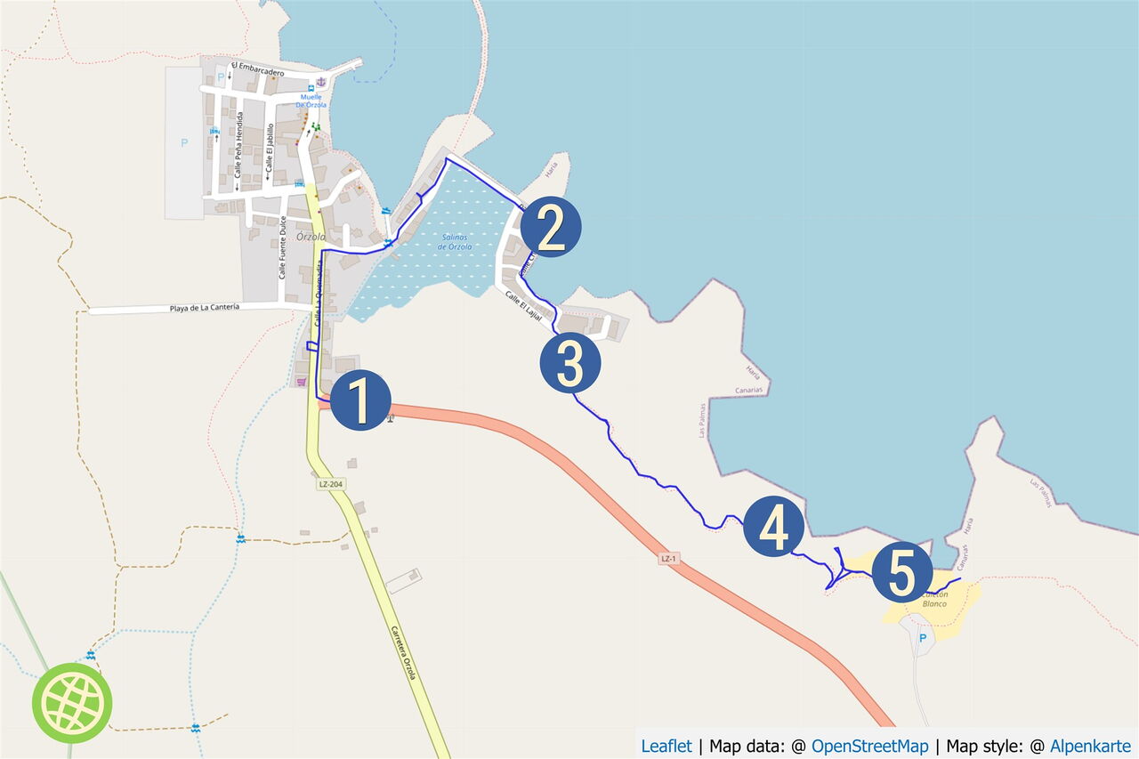 Vom 01 Start und Ziel 16 m, der Bushaltestelle in Orzola, gehen wir bis zur Hauptstraße vor und folgen dieser rechts in Richtung Hafen. Wir passieren einen Supermarkt, bis wir nach 250 m die Hauptstraße nach rechts verlassen. Auf der Asphaltstraße geht es vorbei an einer Bootslipanlage und alten Wasserauffangbecken bis zum Ende der Straße. Hier gehen wir scharf rechts, nun immer an der Küstenlinie entlang.